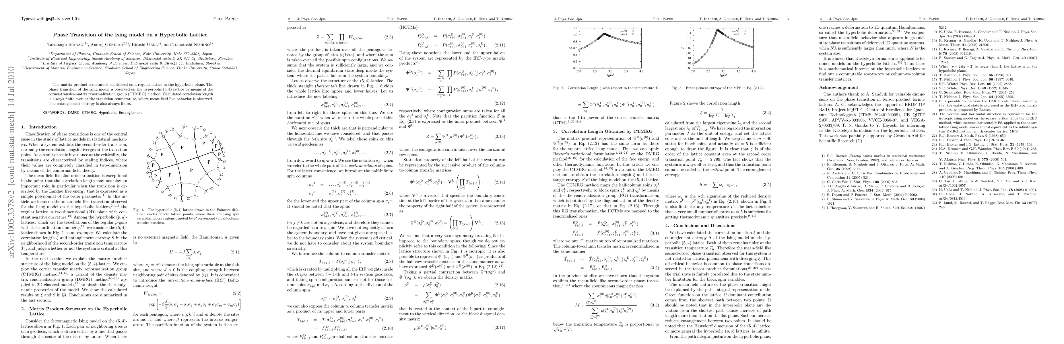 This paper investigates the phase transition of the Ising model on a hyperbolic $(5, 4)$ lattice using the CTMRG method, finding a finite correlation length and mean-field behavior at the transition, alongside finite entanglement entropy.