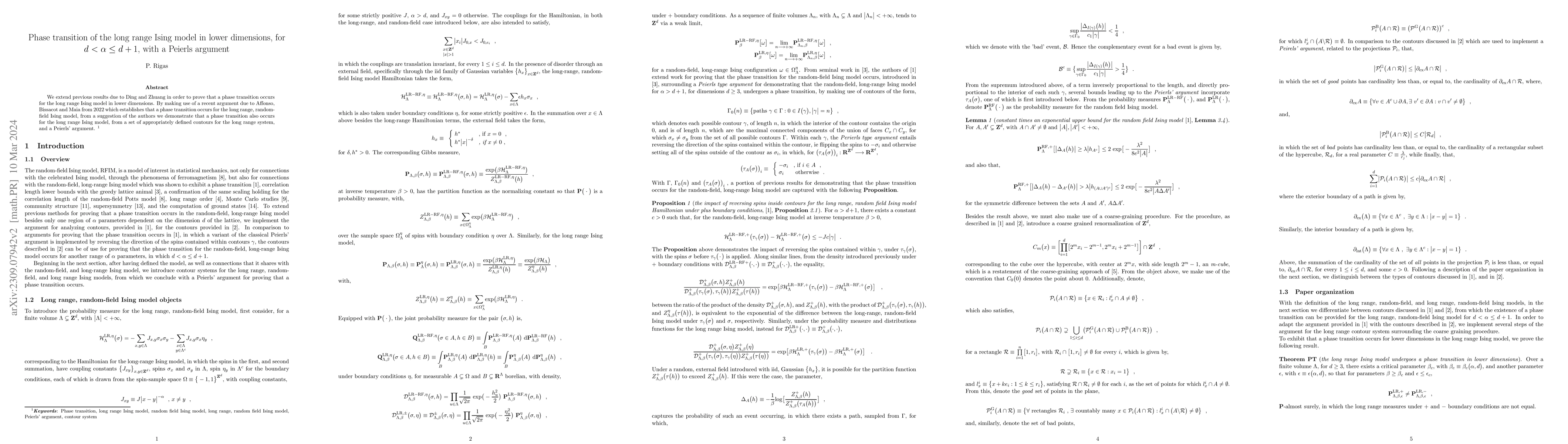 This research extends previous results to demonstrate a phase transition in the long-range Ising model for dimensions below $d < \alpha \leq d + 1$. Utilizing a 2022 argument by Affonso, Bissacot, and Maia and a Peierls' approach, it shows the occurrence of a phase transition via appropriately defined contours for the system.