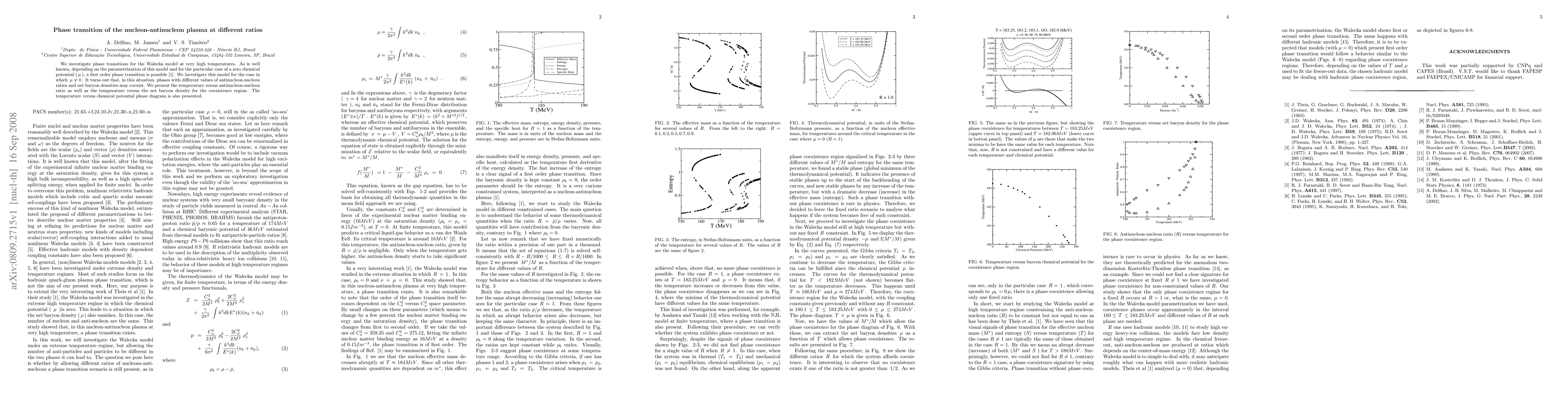 We investigate phase transitions for the Walecka model at very high temperatures. As is well known, depending on the parametrization of this model and for the particular case of a zero chemical potential ($ \mu $), a first order phase transition is possible \cite{theis}. We investigate this model for the case in which $ \mu \ne 0 $. It turns out that, in this situation, phases with different values of antinucleon-nucleon ratios and net baryon densities may coexist. We present the temperature versus antinucleon-nucleon ratio as well as the temperature versus the net baryon density for the coexistence region. The temperature versus chemical potential phase diagram is also presented.