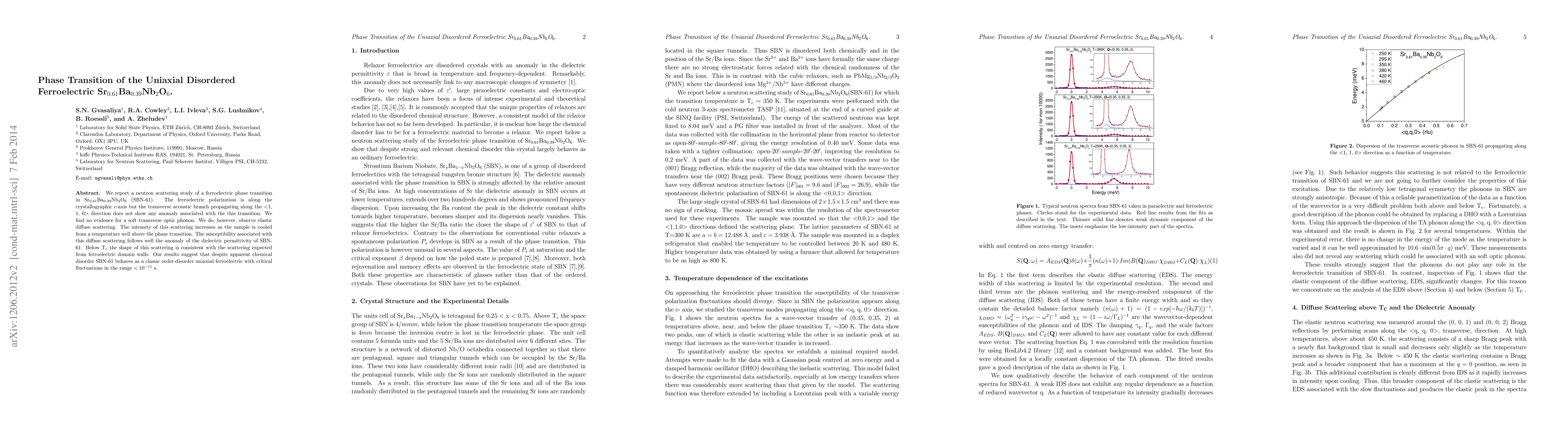 We report a neutron scattering study of a ferroelectric phase transition in Sr$_{0.61}$Ba$_{0.39}$Nb$_2$O$_6$ (SBN-61). The ferroelectric polarization is along the crystallographic $c$-axis but the transverse acoustic branch propagating along the $<$1, 1, 0$>$ direction does not show any anomaly associated with the this transition. We find no evidence for a soft transverse optic phonon. We do, however, observe elastic diffuse scattering. The intensity of this scattering increases as the sample is cooled from a temperature well above the phase transition. The susceptibility associated with this diffuse scattering follows well the anomaly of the dielectric permittivity of SBN-61. Below T$_\mathrm{c}$ the shape of this scattering is consistent with the scattering expected from ferroelectric domain walls. Our results suggest that despite apparent chemical disorder SBN-61 behaves as a classic order-disorder uniaxial ferroelectric with critical fluctuations in the range $<10^{-11}$ s.