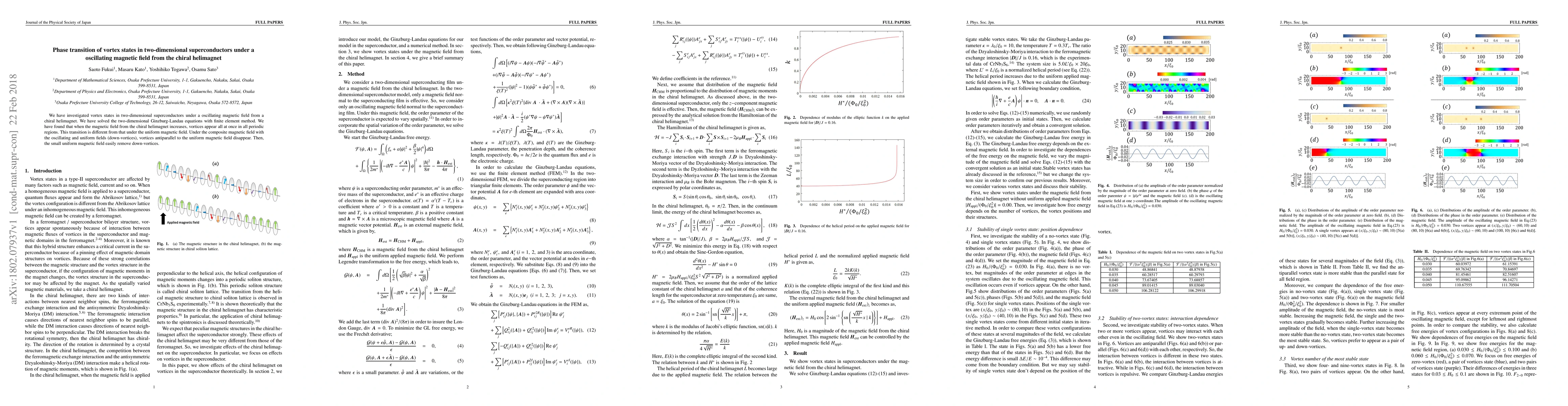Summary: This study investigates vortex states in two-dimensional superconductors under a composite magnetic field from a chiral helimagnet, revealing a distinct phase transition where vortices emerge simultaneously with increasing magnetic field. Under combined oscillating and uniform fields, down-vortices vanish, making them easily removable by a small uniform field.