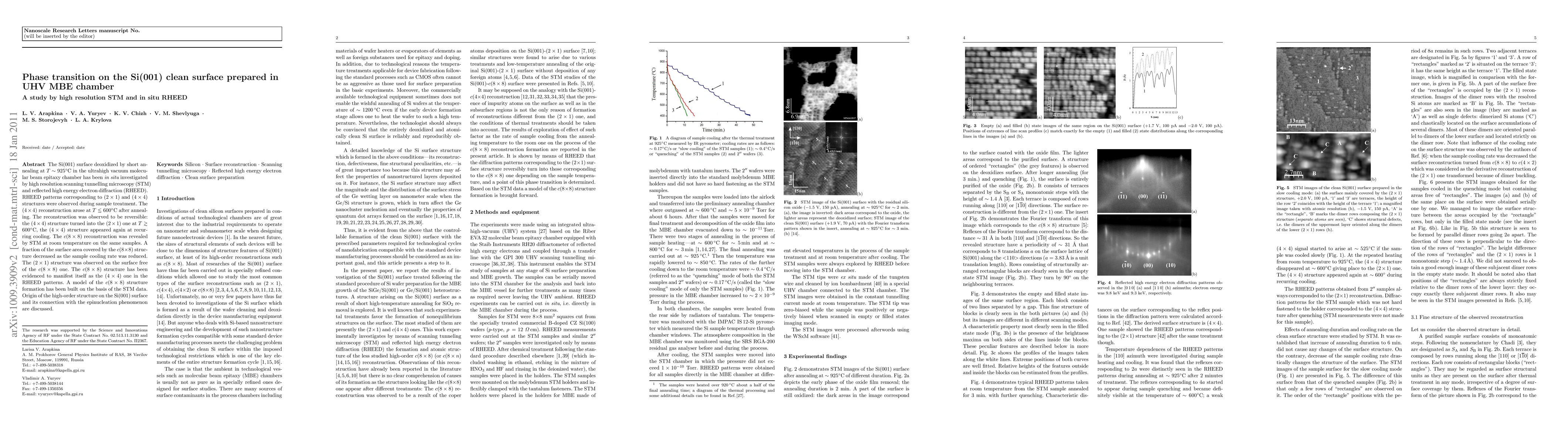 This study investigates the phase transitions on Si(001) clean surfaces prepared in UHV MBE using high-resolution STM and in situ RHEED. The (2x1) and c(8x8) reconstructions were identified, with the latter transforming to (4x4) in RHEED patterns and reverting to (2x1) upon cooling below 600°C, indicating a reversible phase transition around this temperature.