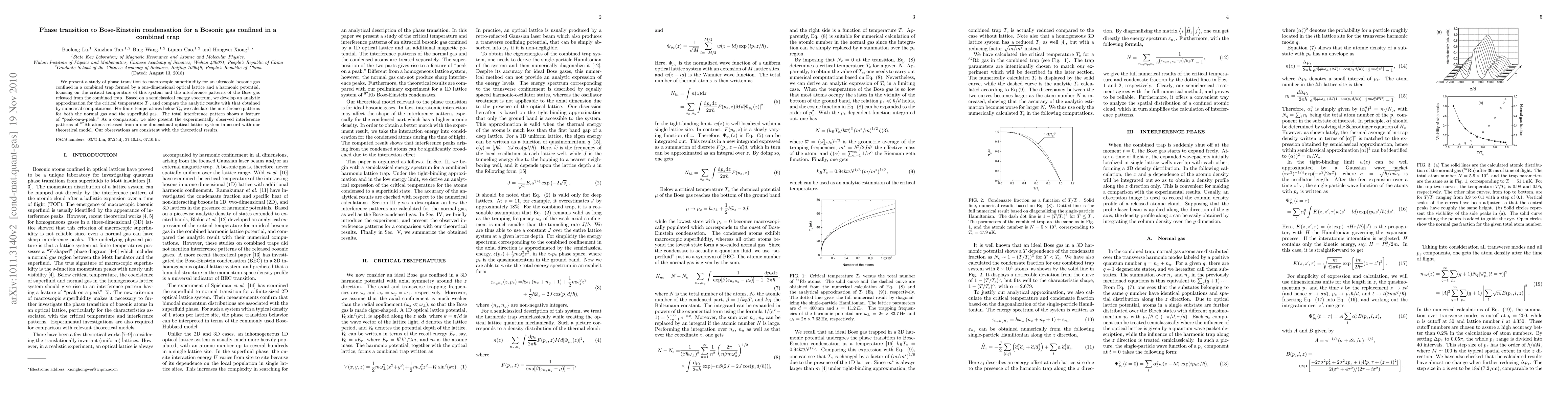 We present a study of phase transition to macroscopic superfluidity for an ultracold bosonic gas confined in a combined trap formed by a one-dimensional optical lattice and a harmonic potential, focusing on the critical temperature of this system and the interference patterns of the Bose gas released from the combined trap. Based on a semiclassical energy spectrum, we develop an analytic approximation for the critical temperature $T_{c}$, and compare the analytic results with that obtained by numerical computations. For finite temperatures below $T_{c}$, we calculate the interference patterns for both the normal gas and the superfluid gas. The total interference pattern shows a feature of ``peak-on-a-peak". As a comparison, we also present the experimentally observed interference patterns of $^{87}$Rb atoms released from a one-dimensional optical lattice system in accord with our theoretical model. Our observations are consistent with the theoretical results.