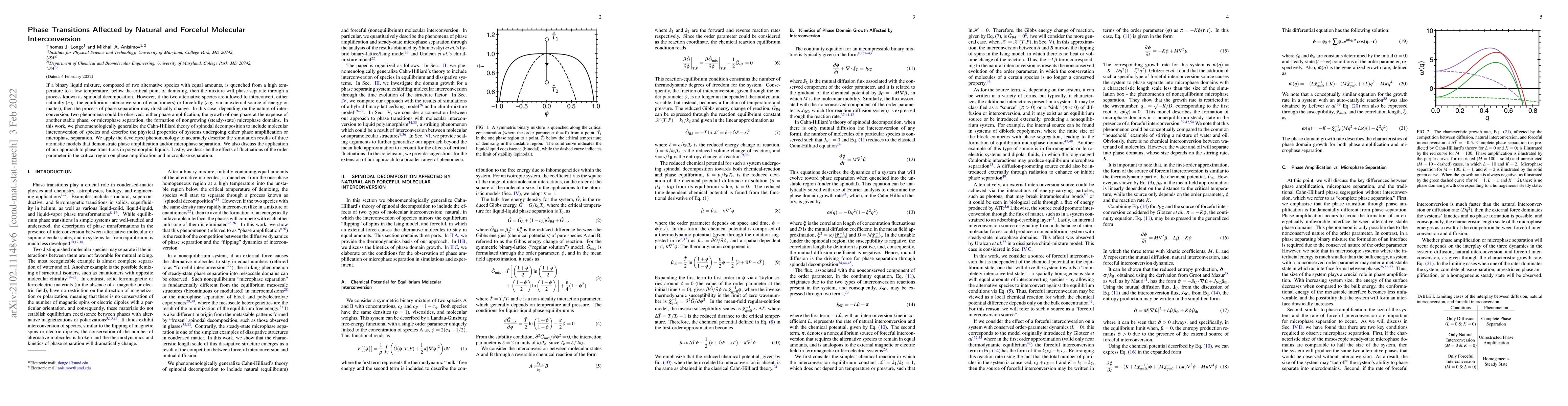 If a binary liquid mixture, composed of two alternative species with equal amounts, is quenched from a high temperature to a low temperature, below the critical point of demixing, then the mixture will phase separate through a process known as spinodal decomposition. However, if the two alternative species are allowed to interconvert, either naturally (e.g. the equilibrium interconversion of enantiomers) or forcefully (e.g. via an external source of energy or matter), then the process of phase separation may drastically change. In this case, depending on the nature of interconversion, two phenomena could be observed: either phase amplification, the growth of one phase at the expense of another stable phase, or microphase separation, the formation of nongrowing (steady-state) microphase domains. In this work, we generalize the Cahn-Hilliard theory of spinodal decomposition to include molecular interconversion of species and describe the physical properties of systems undergoing either phase amplification or microphase separation. We apply the developed theory to describe the simulation results of three atomistic models which demonstrate phase amplification and/or microphase separation. We also discuss the application of our approach to phase transitions in polyamorphic liquids. Lastly, we describe the effects of fluctuations of the order parameter in the critical region on phase amplification and microphase separation.