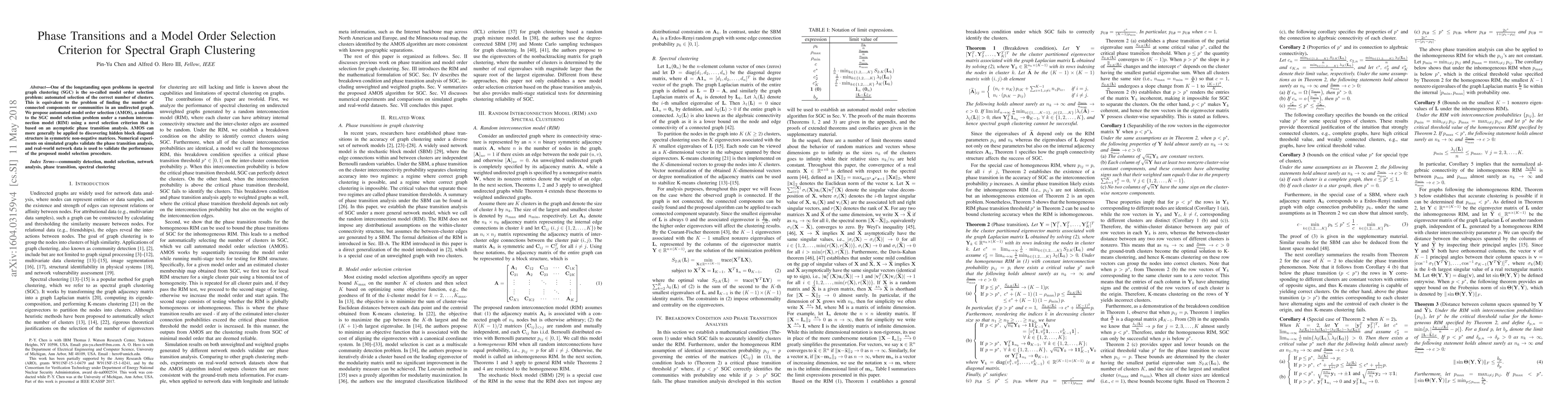 This paper proposes Automated Model Order Selection (AMOS) to address the model selection problem in spectral graph clustering, using a novel criterion based on phase transition analysis under a random interconnection model. Numerical experiments and real-world data validate the effectiveness of the proposed method for determining the number of clusters in undirected graphs.