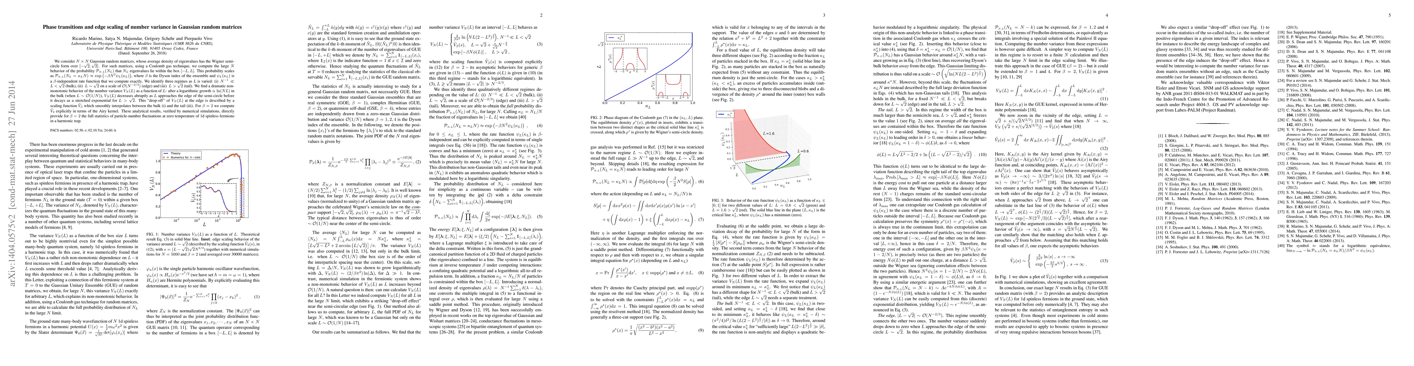 We consider $N\times N$ Gaussian random matrices, whose average density of eigenvalues has the Wigner semi-circle form over $[-\sqrt{2},\sqrt{2}]$. For such matrices, using a Coulomb gas technique, we compute the large $N$ behavior of the probability $\mathcal{P}_{\scriptscriptstyle N,L}(N_L)$ that $N_L$ eigenvalues lie within the box $[-L,L]$. This probability scales as $\mathcal{P}_{\scriptscriptstyle N,L}(N_L=\kappa_L N)\approx\exp\left(-{\beta} N^2 \psi_L(\kappa_L)\right)$, where $\beta$ is the Dyson index of the ensemble and $\psi_L(\kappa_L)$ is a $\beta$-independent rate function that we compute exactly. We identify three regimes as $L$ is varied: (i) $\, N^{-1}\ll L<\sqrt{2}$ (bulk), (ii) $\ L\sim\sqrt{2}$ on a scale of $\mathcal{O}(N^{-{2}/{3}})$ (edge) and (iii) $\ L > \sqrt{2}$ (tail). We find a dramatic non-monotonic behavior of the number variance $V_N(L)$ as a function of $L$: after a logarithmic growth $\propto \ln (N L)$ in the bulk (when $L \sim {\cal O}(1/N)$), $V_N(L)$ decreases abruptly as $L$ approaches the edge of the semi-circle before it decays as a stretched exponential for $L > \sqrt{2}$. This "drop-off" of $V_N(L)$ at the edge is described by a scaling function $\tilde V_{\beta}$ which smoothly interpolates between the bulk (i) and the tail (iii). For $\beta = 2$ we compute $\tilde V_2$ explicitly in terms of the Airy kernel. These analytical results, verified by numerical simulations, directly provide for $\beta=2$ the full statistics of particle-number fluctuations at zero temperature of 1d spinless fermions in a harmonic trap.