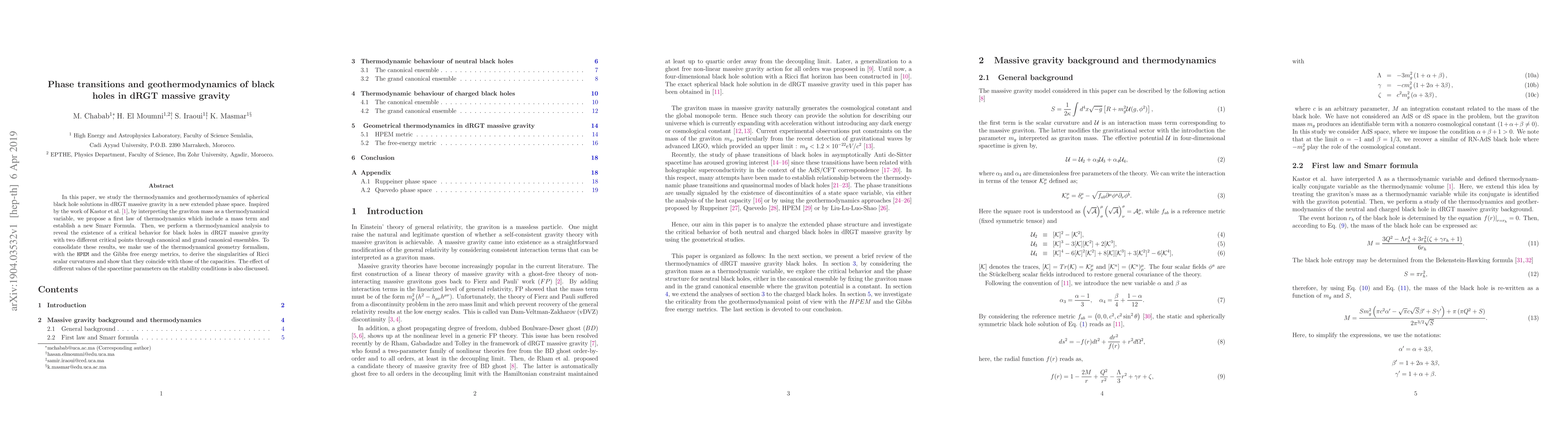 This paper investigates the thermodynamics and geothermodynamics of spherical black holes in dRGT massive gravity, introducing a first law of thermodynamics with a mass term and establishing a new Smarr Formula. It identifies critical behaviors with two distinct critical points and uses thermodynamical geometry to analyze stability conditions, showing the correlation between Ricci scalar singularities and thermodynamic capacities.