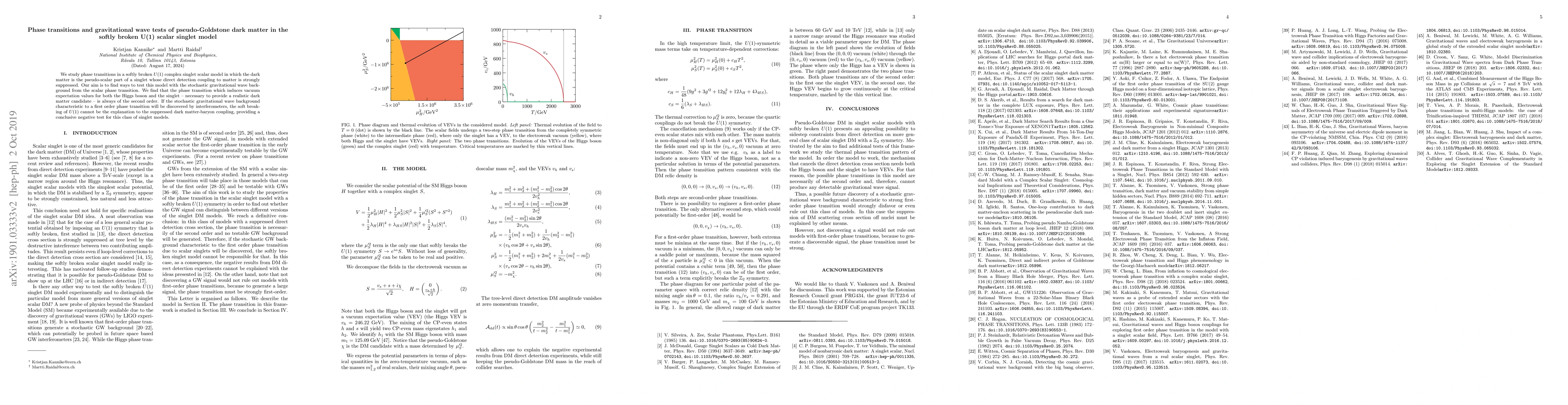 We study phase transitions in a softly broken $U(1)$ complex singlet scalar model in which the dark matter is the pseudo-scalar part of a singlet whose direct detection coupling to matter is strongly suppressed. Our aim is to find ways to test this model with the stochastic gravitational wave background from the scalar phase transition. We find that the phase transition which induces vacuum expectation values for both the Higgs boson and the singlet - necessary to provide a realistic dark matter candidate - is always of the second order. If the stochastic gravitational wave background characteristic to a first order phase transition will be discovered by interferometers, the soft breaking of $U(1)$ cannot be the explanation to the suppressed dark matter-baryon coupling, providing a conclusive negative test for this class of singlet models.