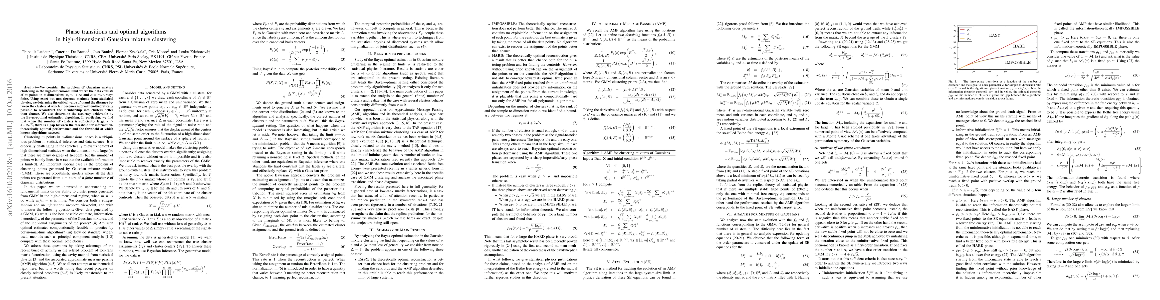 We consider the problem of Gaussian mixture clustering in the high-dimensional limit where the data consists of $m$ points in $n$ dimensions, $n,m \rightarrow \infty$ and $\alpha = m/n$ stays finite. Using exact but non-rigorous methods from statistical physics, we determine the critical value of $\alpha$ and the distance between the clusters at which it becomes information-theoretically possible to reconstruct the membership into clusters better than chance. We also determine the accuracy achievable by the Bayes-optimal estimation algorithm. In particular, we find that when the number of clusters is sufficiently large, $r > 4 + 2 \sqrt{\alpha}$, there is a gap between the threshold for information-theoretically optimal performance and the threshold at which known algorithms succeed.