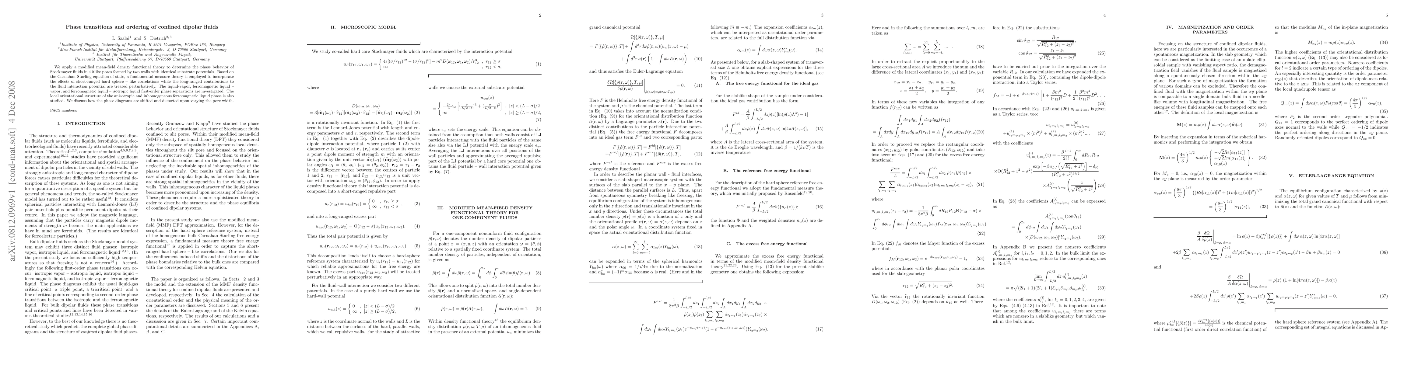 We apply a modified mean-field density functional theory to determine the phase behavior of Stockmayer fluids in slitlike pores formed by two walls with identical substrate potentials. Based on the Carnahan-Starling equation of state, a fundamental-measure theory is employed to incorporate the effects of short-ranged hard sphere - like correlations while the long-ranged contributions to the fluid interaction potential are treated perturbatively. The liquid-vapor, ferromagnetic liquid - vapor, and ferromagnetic liquid - isotropic liquid first-order phase separations are investigated. The local orientational structure of the anisotropic and inhomogeneous ferromagnetic liquid phase is also studied. We discuss how the phase diagrams are shifted and distorted upon varying the pore width.