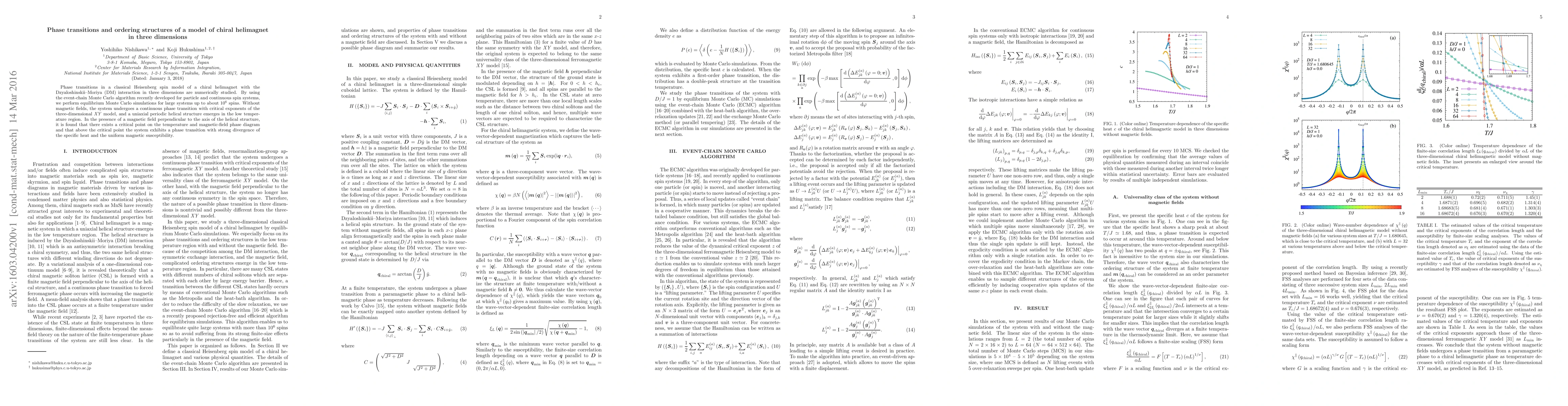 This paper numerically investigates phase transitions in a chiral helimagnet model using advanced Monte Carlo simulations, revealing a continuous phase transition akin to the three-dimensional XY model and a helical structure at low temperatures. The study also finds a critical point in the presence of a perpendicular magnetic field, marked by a phase transition with significant specific heat and susceptibility divergence.
