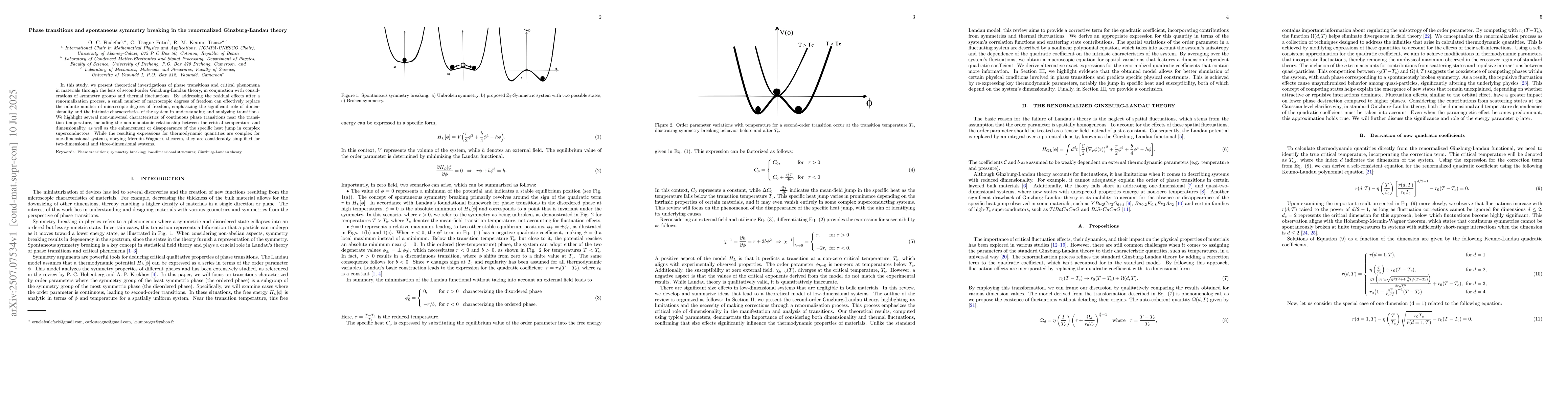 In this study, we present theoretical investigations of phase transitions and critical phenomena in materials through the lens of second-order Ginzburg-Landau theory, in conjunction with considerations of symmetry groups and thermal fluctuations. By addressing the residual effects after a renormalization process, a small number of macroscopic degrees of freedom can effectively replace the infinite number of microscopic degrees of freedom, emphasizing the significant role of dimensionality and the intrinsic characteristics of the system in understanding and analyzing transitions. We highlight several non-universal characteristics of continuous phase transitions near the transition temperature, including the non-monotonic relationship between the critical temperature and dimensionality, as well as the enhancement or disappearance of the specific heat jump in complex superconductors. While the resulting expressions for thermodynamic quantities are complex for one-dimensional systems, obeying Mermin-Wagner's theorem, they are considerably simplified for two-dimensional and three-dimensional systems.