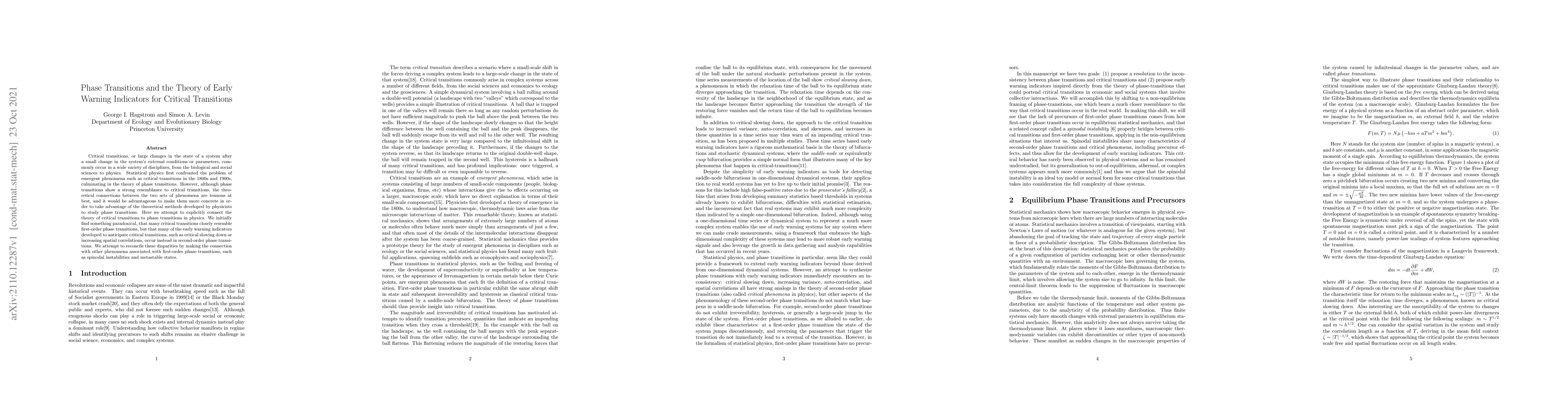 This paper explores the theoretical connections between critical transitions and phase transitions, noting that while critical transitions resemble first-order phase transitions, early warning indicators often align with second-order phase transitions. The study aims to reconcile these differences by linking critical transitions to phenomena associated with first-order phase transitions, such as spinodal instabilities and metastable states.