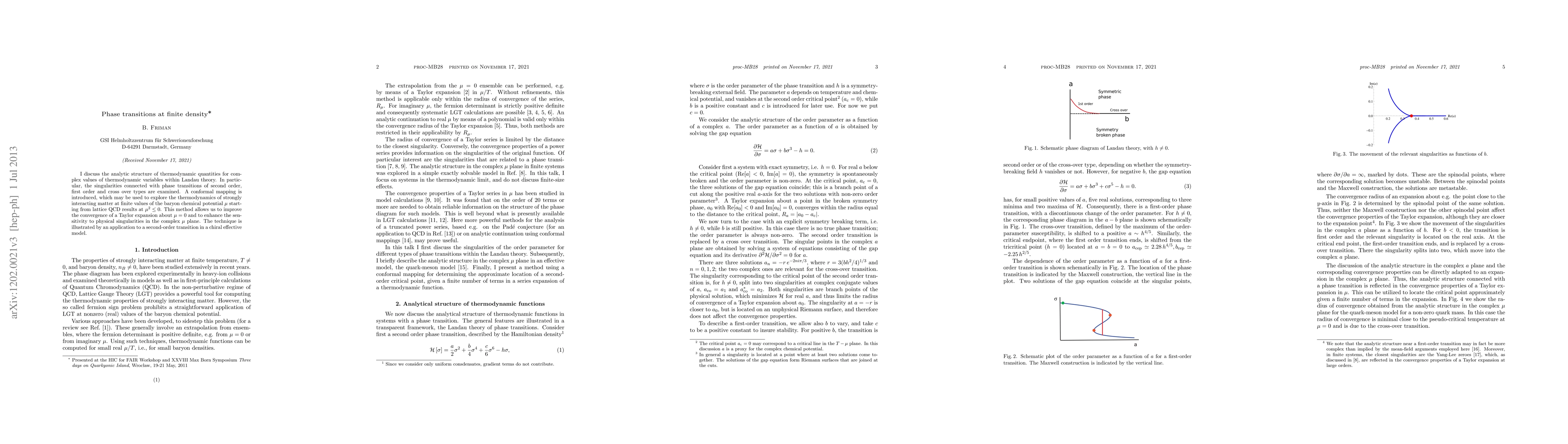 I discuss the analytic structure of thermodynamic quantities for complex values of thermodynamic variables within Landau theory. In particular, the singularities connected with phase transitions of second order, first order and cross over types are examined. A conformal mapping is introduced, which may be used to explore the thermodynamics of strongly interacting matter at finite values of the baryon chemical potential $\mu$ starting from lattice QCD results at $\mu^{2}\leq 0$. This method allows us to improve the convergence of a Taylor expansion about $\mu=0$ and to enhance the sensitivity to physical singularities in the complex $\mu$ plane. The technique is illustrated by an application to a second-order transition in a chiral effective model.