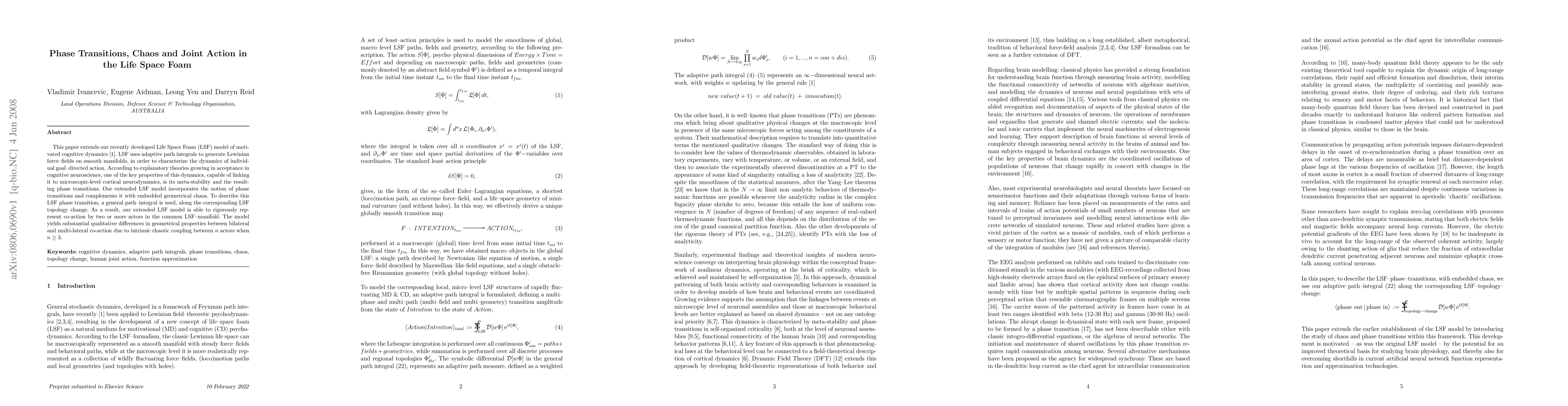 This paper extends our recently developed Life Space Foam (LSF) model of motivated cognitive dynamics \cite{IA}. LSF uses adaptive path integrals to generate Lewinian force--fields on smooth manifolds, in order to characterize the dynamics of individual goal--directed action. According to explanatory theories growing in acceptance in cognitive neuroscience, one of the key properties of this dynamics, capable of linking it to microscopic-level cortical neurodynamics, is its meta-stability and the resulting phase transitions. Our extended LSF model incorporates the notion of phase transitions and complements it with embedded geometrical chaos. To describe this LSF phase transition, a general path--integral is used, along the corresponding LSF topology change. As a result, our extended LSF model is able to rigorously represent co-action by two or more actors in the common LSF--manifold. The model yields substantial qualitative differences in geometrical properties between bilateral and multi-lateral co-action due to intrinsic chaotic coupling between $n$ actors when $n\geq 3$. Keywords: cognitive dynamics, adaptive path integrals, phase transitions, chaos, topology change, human joint action, function approximation