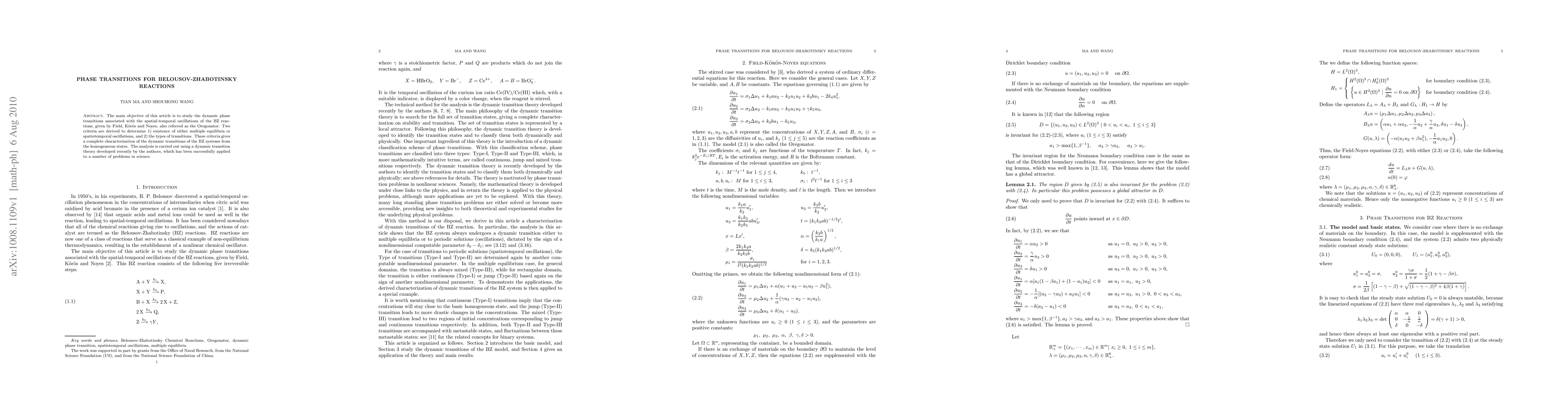 The main objective of this article is to study the dynamic phase transitions associated with the spatial-temporal oscillations of the BZ reactions, given by Field, Koros and Noyes, also referred as the Oregonator. Two criteria are derived to determine 1) existence of either multiple equilibria or spatiotemporal oscillations, and 2) the types of transitions. These criteria gives a complete characterization of the dynamic transitions of the BZ systems from the homogeneous states. The analysis is carried out using a dynamic transition theory developed recently by the authors, which has been successfully applied to a number of problems in science.
