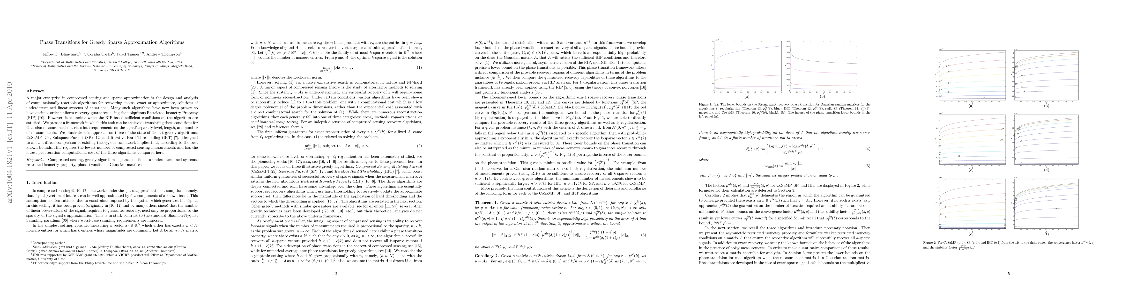 This paper develops a framework to analyze the conditions under which greedy sparse approximation algorithms like CoSaMP, Subspace Pursuit, and Iterative Hard Thresholding meet the Restricted Isometry Property (RIP) for Gaussian measurement matrices. It finds that Iterative Hard Thresholding requires fewer measurements and has lower computational costs compared to the other two algorithms.
