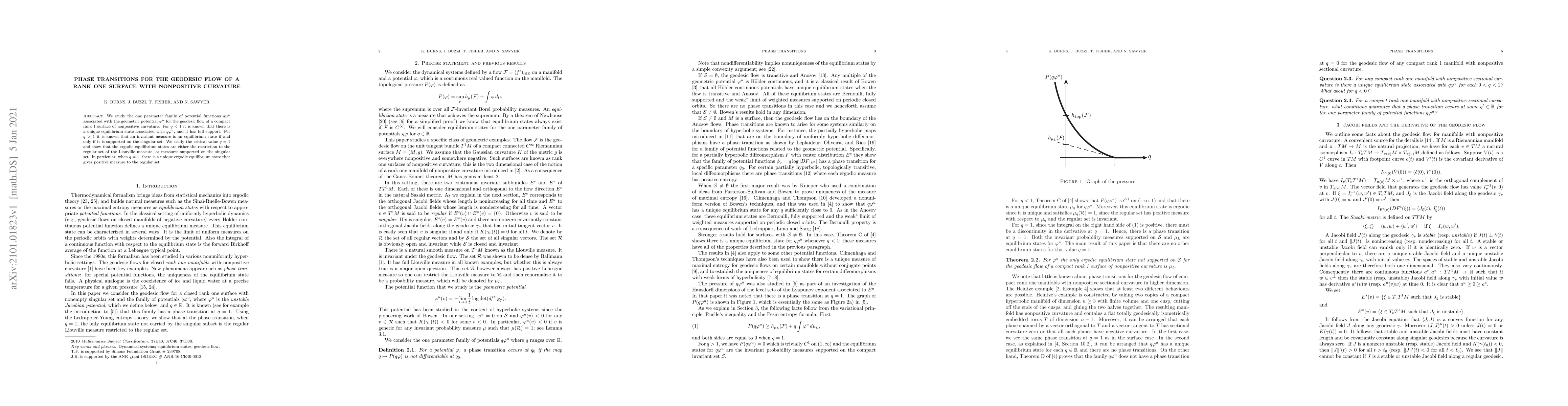This paper investigates the phase transitions in the geodesic flow of a compact rank one surface with nonpositive curvature, focusing on the potential functions $q\varphi^u$. For $q<1$, a unique equilibrium state exists with full support, while for $q>1$, equilibrium states are supported on the singular set. The study reveals that at the critical value $q=1$, the ergodic equilibrium states either restrict the Liouville measure to the regular set or are supported on the singular set, with a unique ergodic equilibrium state giving positive measure to the regular set.