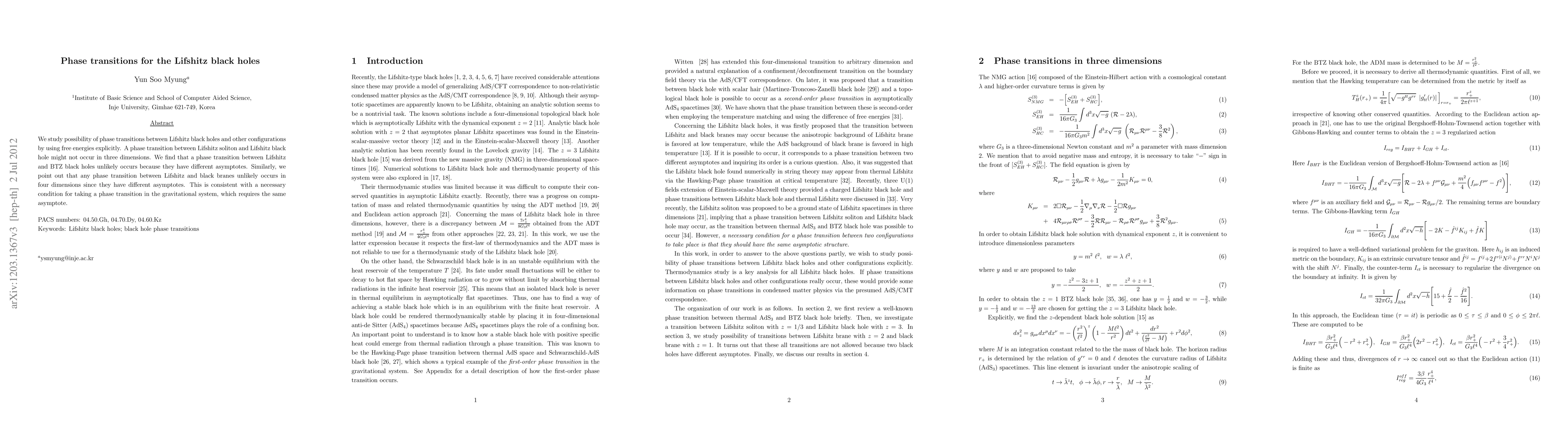 We study possibility of phase transitions between Lifshitz black holes and other configurations by using free energies explicitly. A phase transition between Lifshitz soliton and Lifshitz black hole might not occur in three dimensions. We find that a phase transition between Lifshitz and BTZ black holes unlikely occurs because they have different asymptotes. Similarly, we point out that any phase transition between Lifshitz and black branes unlikely occurs in four dimensions since they have different asymptotes. This is consistent with a necessary condition for taking a phase transition in the gravitational system, which requires the same asymptote.