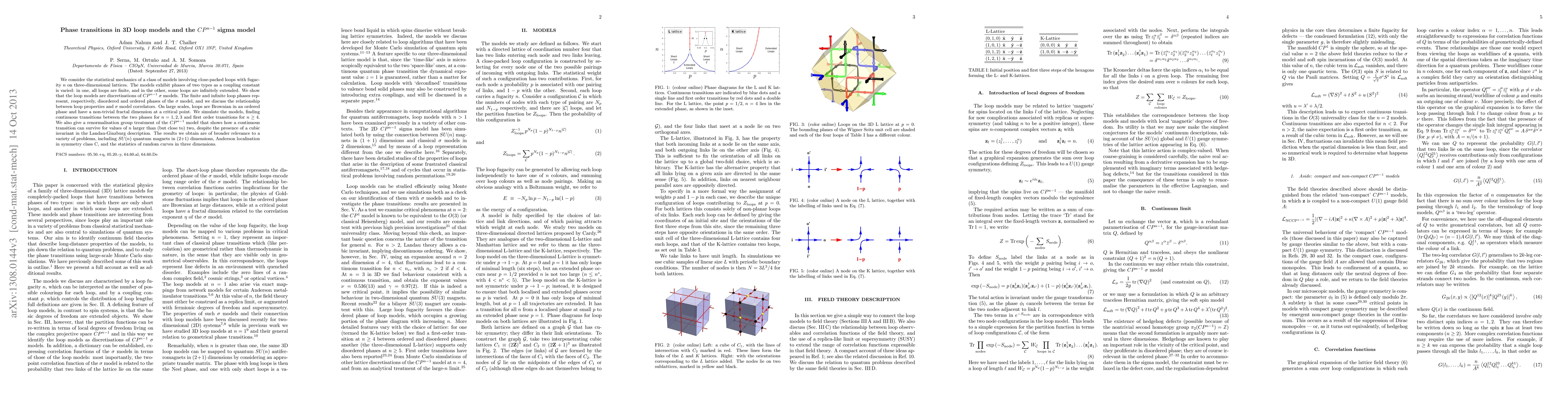 This paper investigates phase transitions in 3D loop models, showing they correspond to the $CP^{n-1}$ $\sigma$ model, with finite and infinite loop phases representing disordered and ordered phases, respectively. Simulations reveal continuous transitions for $n=1,2,3$ and first-order transitions for $n\geq 4$, while renormalization group analysis extends the continuous transition to values of $n$ close to but greater than two.