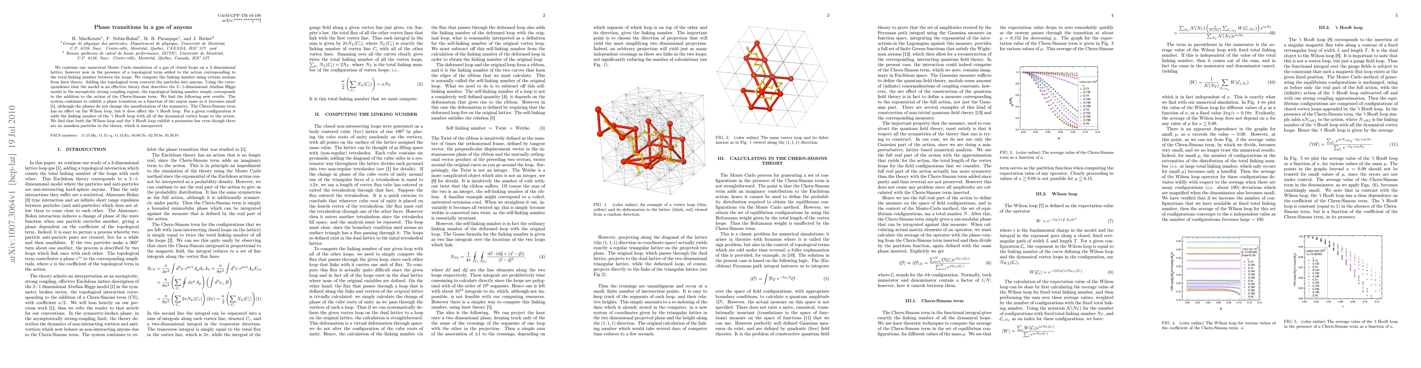 We continue our numerical Monte Carlo simulation of a gas of closed loops on a 3 dimensional lattice, however now in the presence of a topological term added to the action corresponding to the total linking number between the loops. We compute the linking number using certain notions from knot theory. Adding the topological term converts the particles into anyons. Using the correspondence that the model is an effective theory that describes the 2+1-dimensional Abelian Higgs model in the asymptotic strong coupling regime, the topological linking number simply corresponds to the addition to the action of the Chern-Simons term. We find the following new results. The system continues to exhibit a phase transition as a function of the anyon mass as it becomes small \cite{mnp}, although the phases do not change the manifestation of the symmetry. The Chern-Simons term has no effect on the Wilson loop, but it does affect the {\rm '}t Hooft loop. For a given configuration it adds the linking number of the 't Hooft loop with all of the dynamical vortex loops to the action. We find that both the Wilson loop and the 't Hooft loop exhibit a perimeter law even though there are no massless particles in the theory, which is unexpected.