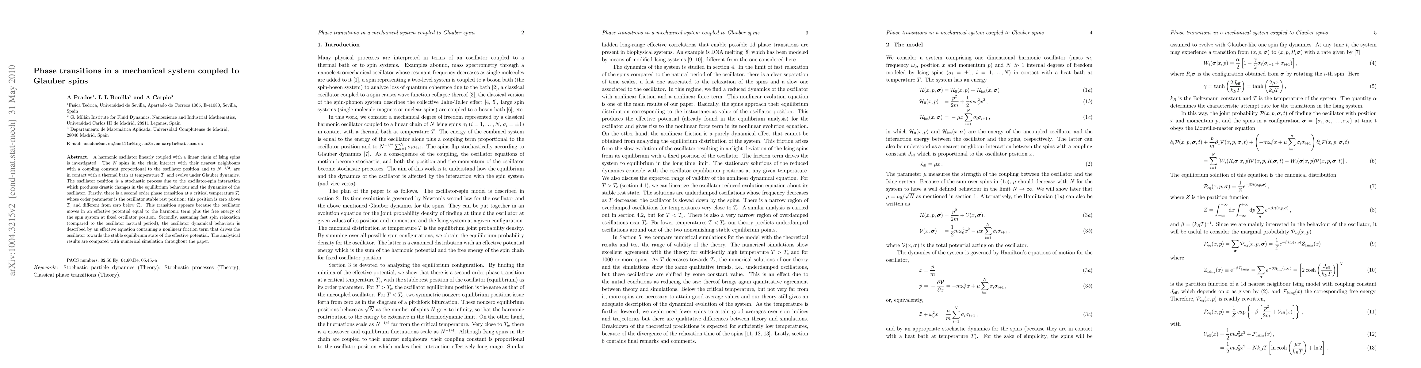 This paper investigates a harmonic oscillator coupled to a linear chain of Glauber spins, revealing a second-order phase transition at a critical temperature $T_c$ where the oscillator's stable rest position changes from zero to a non-zero value. The dynamics are influenced by a nonlinear friction term derived from the spin system's free energy.