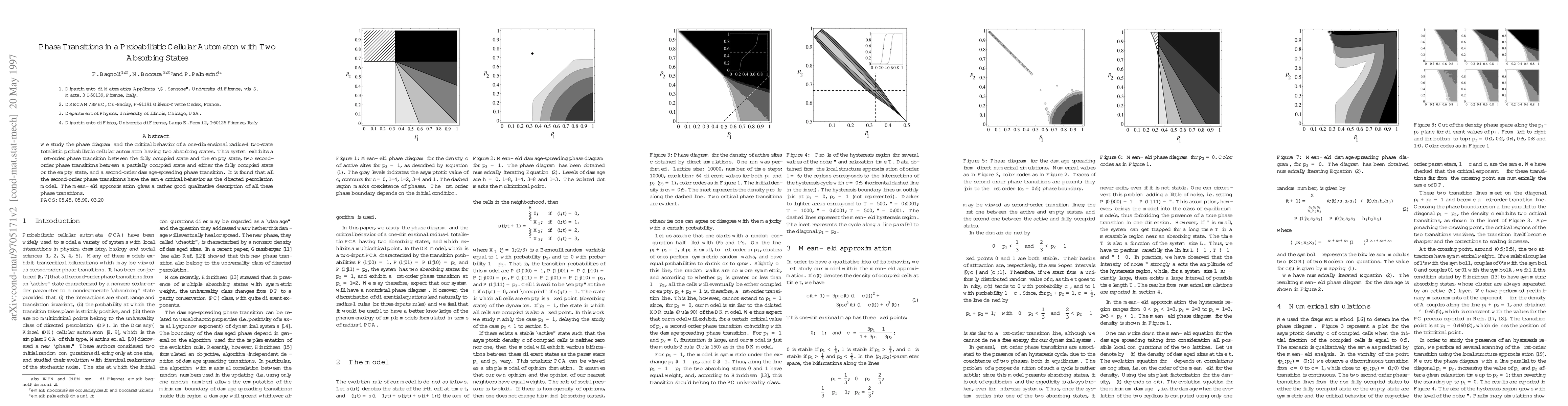 This paper investigates the phase transitions of a one-dimensional probabilistic cellular automaton with two absorbing states, revealing first-order and second-order transitions, and finding that the latter share critical behavior with the directed percolation model. The mean-field approximation provides a good qualitative description of these transitions.