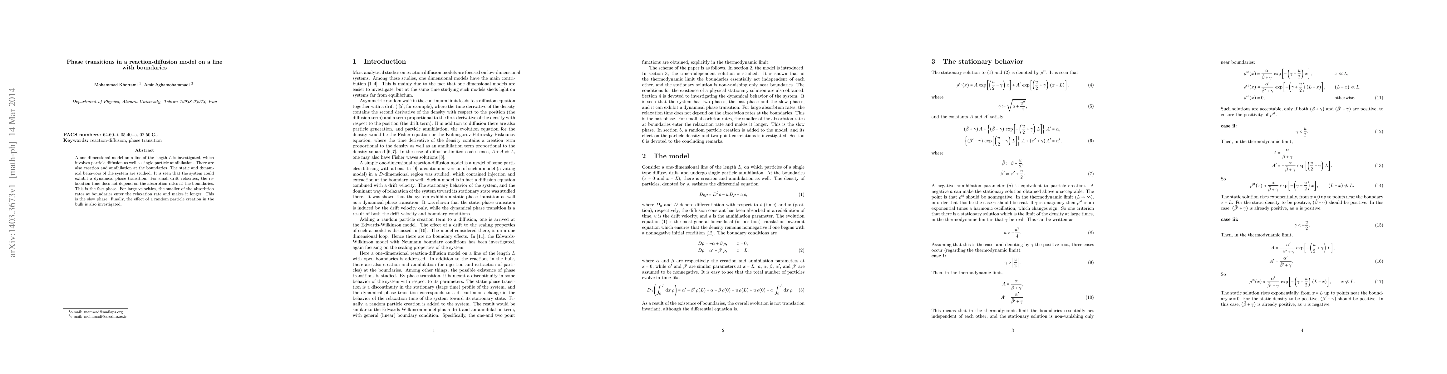 A one-dimensional model on a line of the length L is investigated, which involves particle diffusion as well as single particle annihilation. There are also creation and annihilation at the boundaries. The static and dynamical behaviors of the system are studied. It is seen that the system could exhibit a dynamical phase transition. For small drift velocities, the relaxation time does not depend on the absorbtion rates at the boundaries. This is the fast phase. For large velocities, the smaller of the absorbtion rates at boundaries enter the relaxation rate and makes it longer. This is the slow phase. Finally, the effect of a random particle creation in the bulk is also investigated.