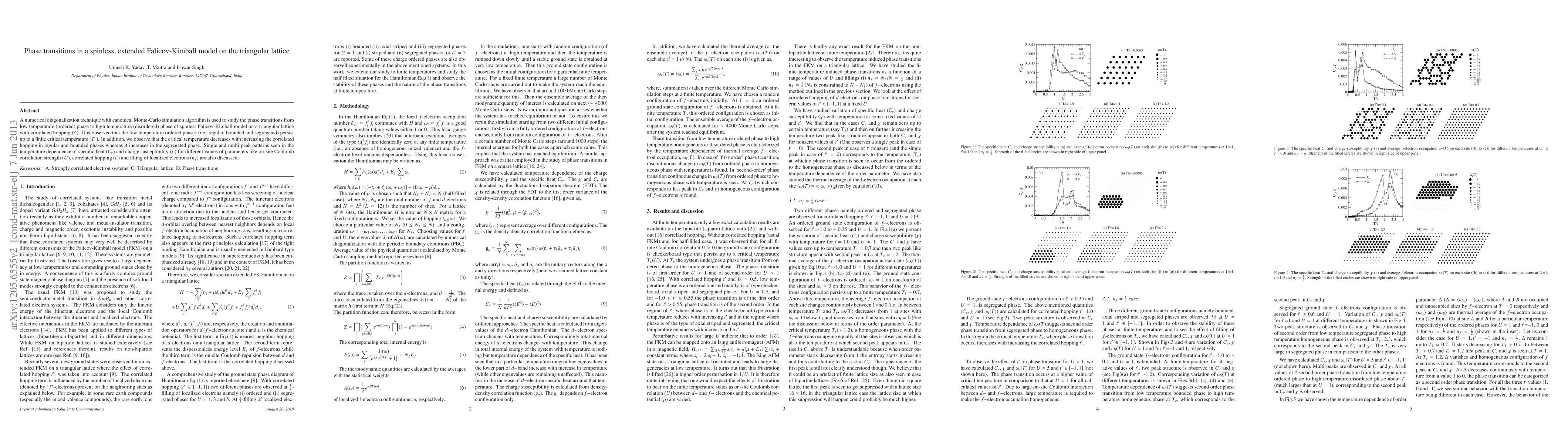 This paper investigates phase transitions in a spinless Falicov-Kimball model on a triangular lattice using a combination of numerical diagonalization and Monte-Carlo simulations. The study reveals that ordered phases persist up to a critical temperature $T_{c}$, which varies with correlated hopping $t^{\prime}$ and other parameters.