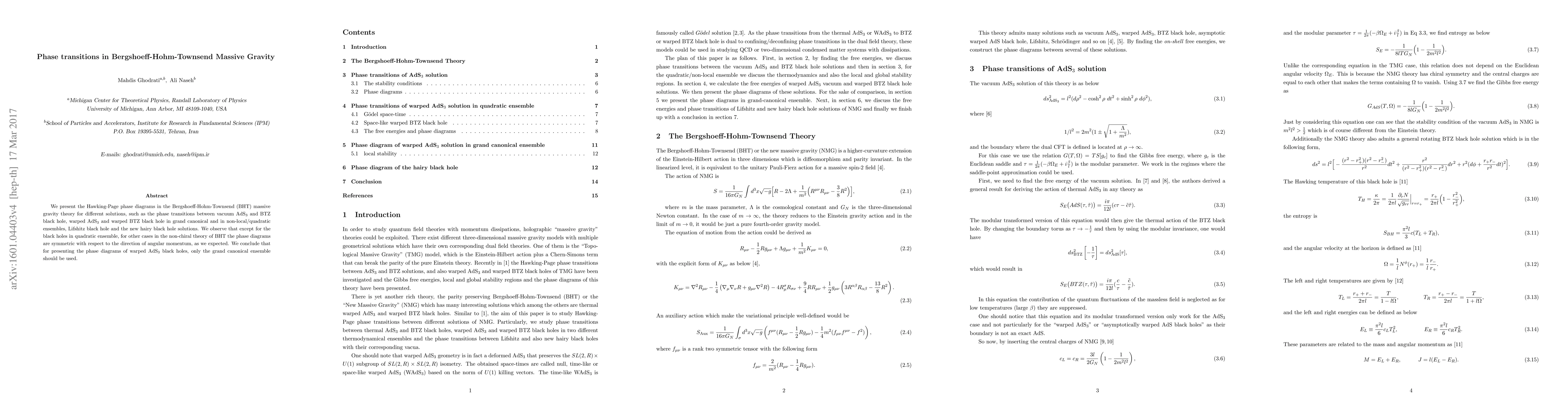 This paper investigates the Hawking-Page phase transitions in Bergshoeff-Hohm-Townsend massive gravity, focusing on various solutions including vacuum AdS₃, BTZ black holes, and Lifshitz black holes. The study finds that phase diagrams are symmetric except for black holes in the quadratic ensemble, recommending the grand canonical ensemble for warped AdS₃ black holes.