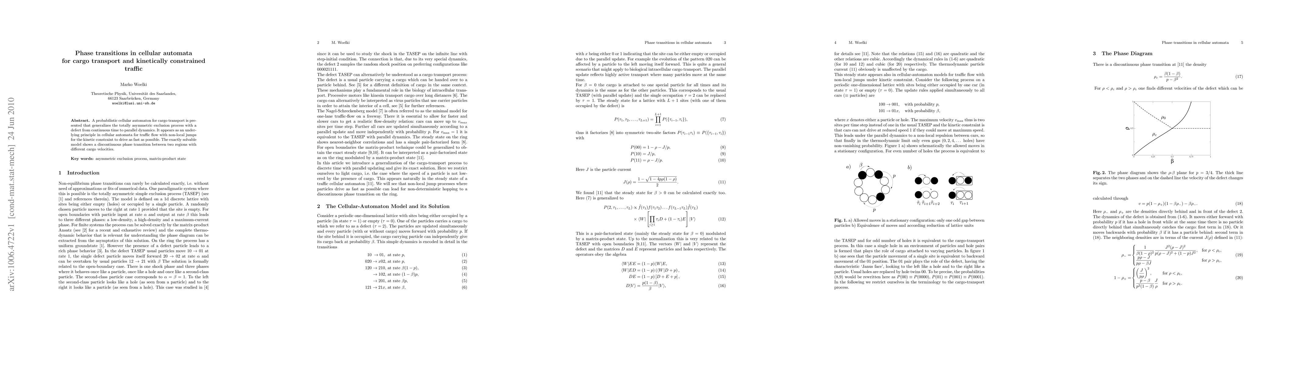 The paper introduces a probabilistic cellular automaton for cargo transport that generalizes the totally asymmetric exclusion process with a defect, revealing a discontinuous phase transition between regions with differing cargo velocities. This model also underpins traffic flow dynamics in kinetically constrained systems.