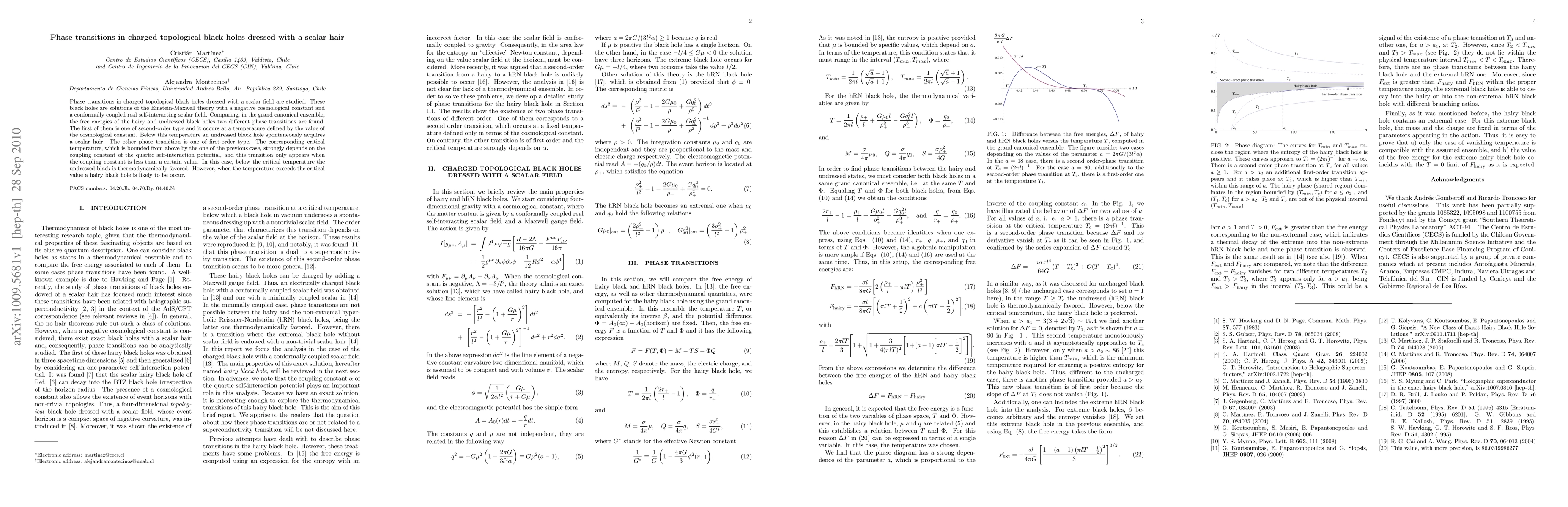 This paper investigates phase transitions in charged topological black holes with scalar hair, revealing two distinct transitions: a second-order transition where undressed black holes acquire scalar hair below a temperature defined by the cosmological constant, and a first-order transition dependent on the scalar field's self-interaction coupling constant.