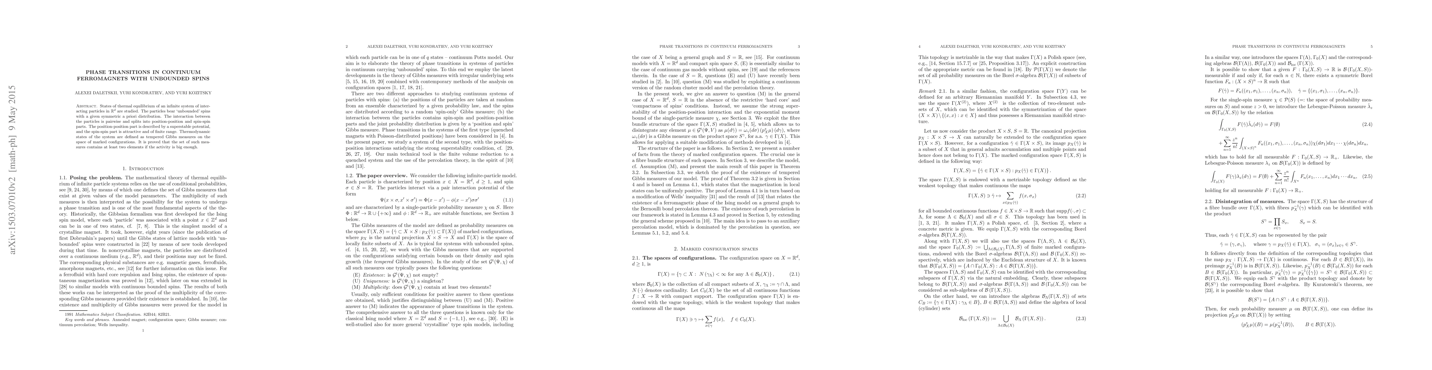 States of thermal equilibrium of an infinite system of interacting particles in a Euclidean space are studied. The particles bear 'unbounded' spins with a given symmetric a priori distribution. The interaction between the particles is pairwise and splits into position-position and spin-spin parts. The position-position part is described by a superstable potential, and the spin-spin part is attractive and of finite range. Thermodynamic states of the system are defined as tempered Gibbs measures on the space of marked configurations. It is proved that the set of such measures contains at least two elements if the activity is big enough.