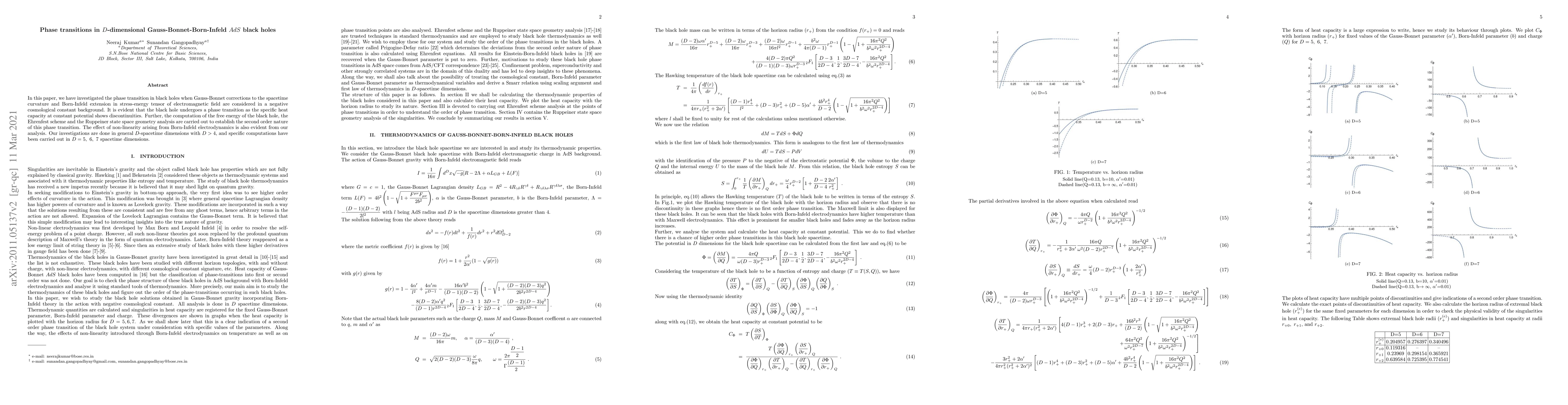 This paper investigates phase transitions in D-dimensional AdS black holes incorporating Gauss-Bonnet corrections and Born-Infeld electrodynamics, revealing second-order transitions marked by discontinuities in specific heat capacity. The study also applies free energy computation and Ruppeiner geometry analysis across D > 4 dimensions, with detailed results for D = 5, 6, 7.