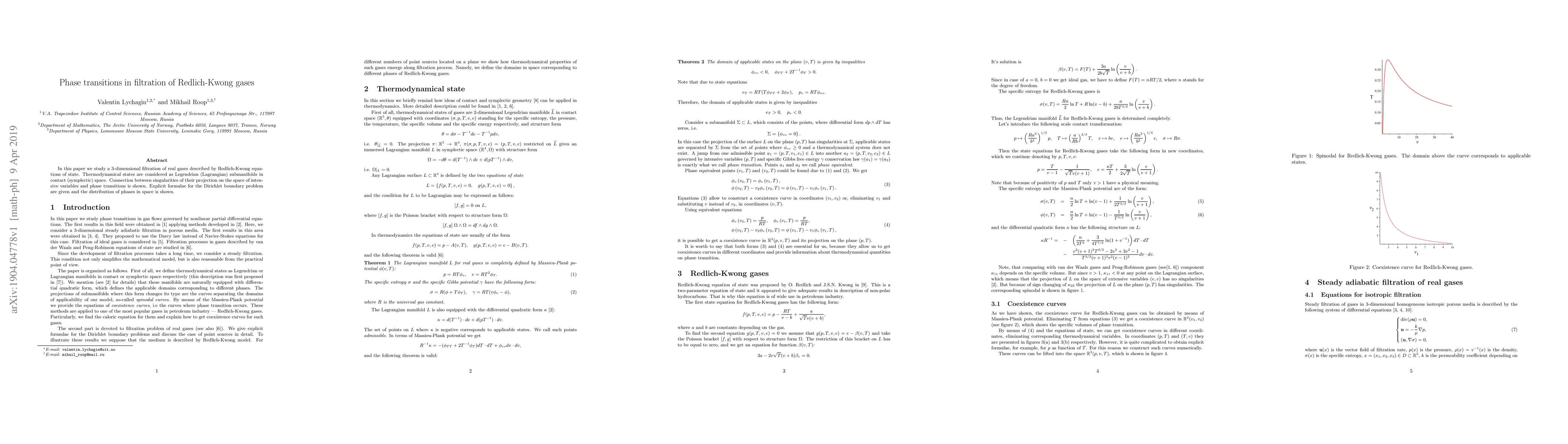 In this paper we study a 3-dimensional filtration of real gases described by Redlich-Kwong equations of state. Thermodynamical states are considered as Legendrian (Lagrangian) submanifolds in contact (symplectic) space. Connection between singularities of their projection on the space of intensive variables and phase transitions is shown. Explicit formulae for the Dirichlet boundary problem are given and the distribution of phases in space is shown.