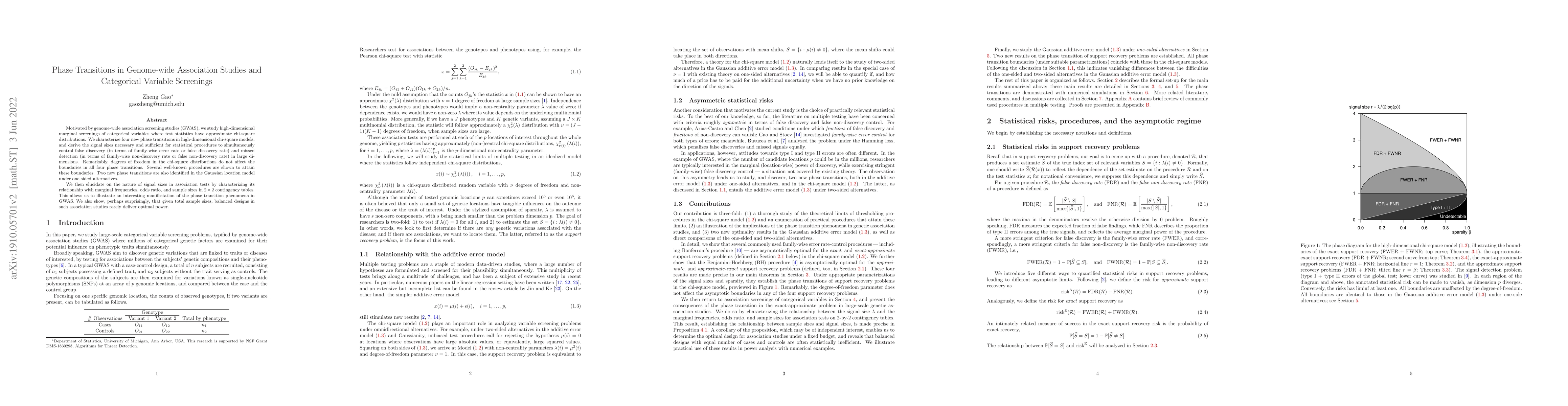 Motivated by genome-wide association screening studies (GWAS), we study high-dimensional marginal screenings of categorical variables where test statistics have approximate chi-square distributions. We characterize four new phase transitions in high-dimensional chi-square models, and derive the signal sizes necessary and sufficient for statistical procedures to simultaneously control false discovery (in terms of family-wise error rate or false discovery rate) and missed detection (in terms of family-wise non-discovery rate or false non-discovery rate) in large dimensions. Remarkably, degrees of freedom in the chi-square distributions do not affect the boundaries in all four phase transitions. Several well-known procedures are shown to attain these boundaries. Two new phase transitions are also identified in the Gaussian location model under one-sided alternatives. We then elucidate on the nature of signal sizes in association tests by characterizing its relationship with marginal frequencies, odds ratio, and sample sizes in $2\times2$ contingency tables. This allows us to illustrate an interesting manifestation of the phase transition phenomena in genome-wide association studies (GWAS). We also show, perhaps surprisingly, that given total sample sizes, balanced designs in such association studies rarely deliver optimal power for detecting the effects of rare genetic variants.