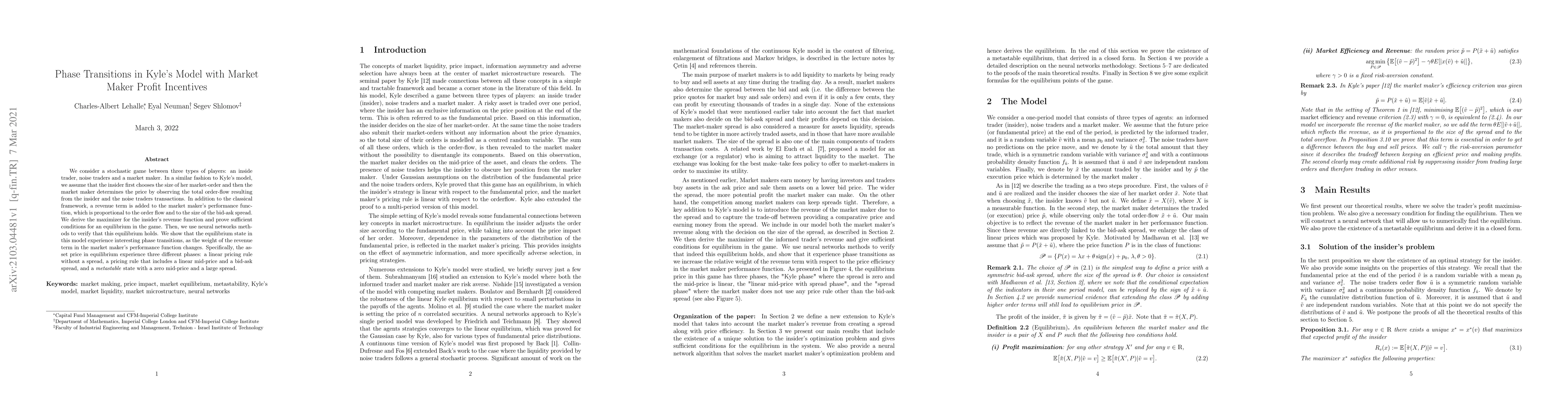 We consider a stochastic game between three types of players: an inside trader, noise traders and a market maker. In a similar fashion to Kyle's model, we assume that the insider first chooses the size of her market-order and then the market maker determines the price by observing the total order-flow resulting from the insider and the noise traders transactions. In addition to the classical framework, a revenue term is added to the market maker's performance function, which is proportional to the order flow and to the size of the bid-ask spread. We derive the maximizer for the insider's revenue function and prove sufficient conditions for an equilibrium in the game. Then, we use neural networks methods to verify that this equilibrium holds. We show that the equilibrium state in this model experience interesting phase transitions, as the weight of the revenue term in the market maker's performance function changes. Specifically, the asset price in equilibrium experience three different phases: a linear pricing rule without a spread, a pricing rule that includes a linear mid-price and a bid-ask spread, and a metastable state with a zero mid-price and a large spread.