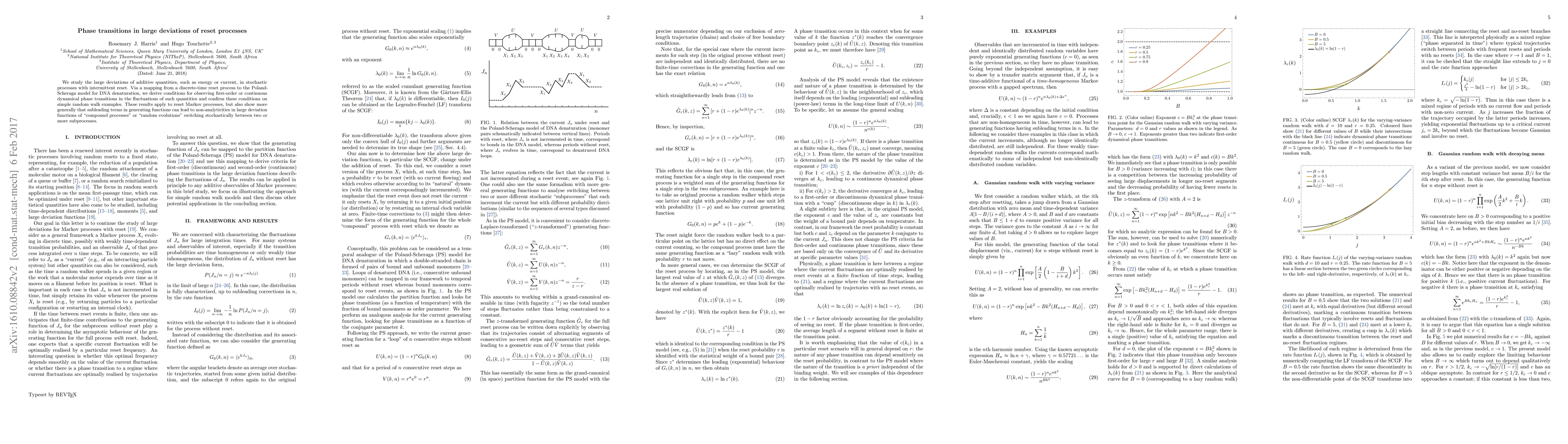This paper investigates large deviations in stochastic processes with intermittent reset, mapping these to the Poland-Scheraga model for DNA denaturation. It identifies conditions for first-order or continuous phase transitions in fluctuations and verifies these conditions through simple random walk examples.