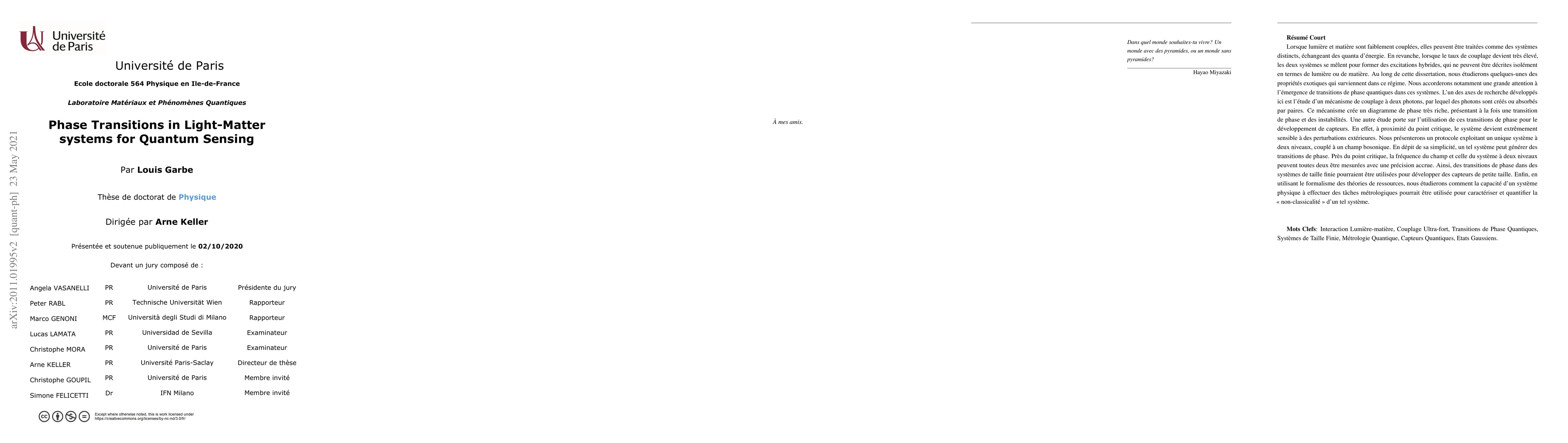When light and matter are weakly coupled, they can be described as two distinctive systems exchanging quanta of energy. By contrast, for very large coupling strength, the systems hybridize and form compounds that cannot be described in terms of light or matter only. In this Thesis, we study some exotic properties which arise in this regime. In particular, we are interested in the possibility to engineer quantum phase transitions in these systems. One direction we explore is the study of two-photon coupling, a mechanism in which matter creates or absorb photons by pairs. This mechanism creates a rich phase diagram containing both phase transitions and instabilities. A second topic is the use of these transitions for sensing applications. Indeed, near the critical point, the system becomes extremely sensitive to external perturbations. We study a setup in which a single qubit is coupled to a bosonic field. We show that even this finite-size system displays a phase transition, which can be used to measure the frequency of the qubit and the field with improved accuracy. This protocol could be used to develop small-scale sensors. Finally, we study how the ability of a system to perform certain metrological tasks could be used to characterize and quantify nonclassicality, by using the formalism of resource theories. The first three chapters present the main concepts and key results in the fields of ultrastrong light-matter coupling, superradiant phase transitions, and quantum metrology. I have strived to write these chapters pedagogically; they can be used by non-specialists or students as an introduction to these domains. The three other chapters present my own research contributions. Although most of those have already been published elsewhere, this manuscript contains additional results, remarks, and perspectives, and should be considered as an improved version of the original papers.