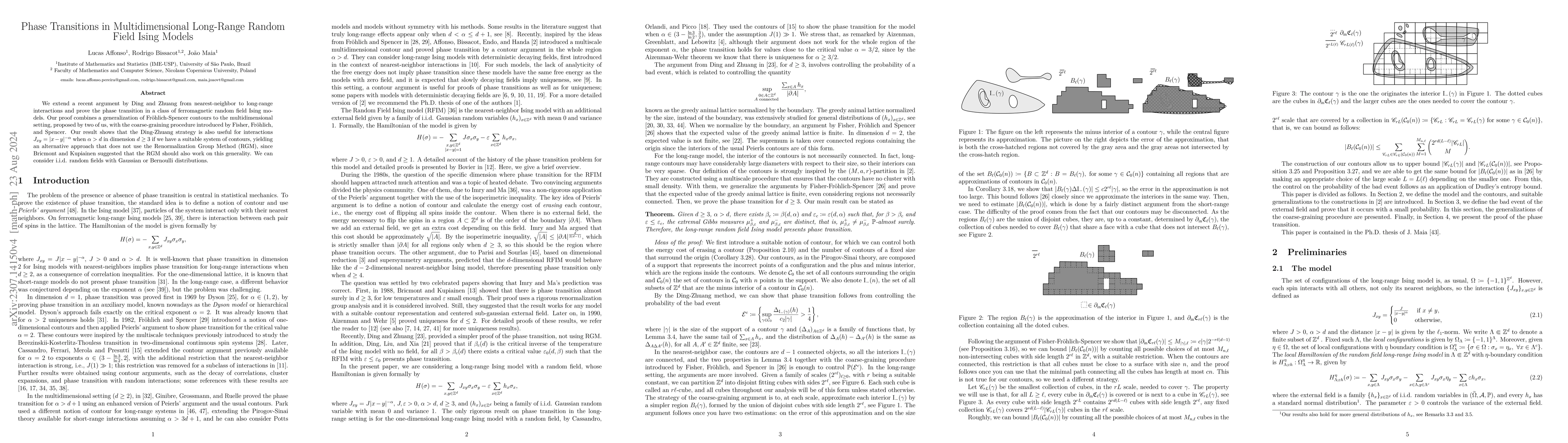 We extend the recent argument by Ding and Zhuang from nearest-neighbor to long-range interactions and prove the phase transition in the class of ferromagnetic random field Ising models. Our proof combines a generalization of Fr\"ohlich-Spencer contours to the multidimensional setting, proposed by two of us, with the coarse-graining procedure introduced by Fisher, Fr\"ohlich and Spencer. The result shows that the Ding-Zhuang strategy is also useful for interactions $J_{xy}=|x-y|^{- \alpha}$ when $\alpha > d$ in dimension $d\geq 3$ if we have a suitable system of contours. We can consider i.i.d. random fields with Gaussian or Bernoulli distributions. Our main result is an alternative proof that does not use the Renormalization Group Method (RGM), since Bricmont and Kupiainen claimed that the RGM should also work on this generality.