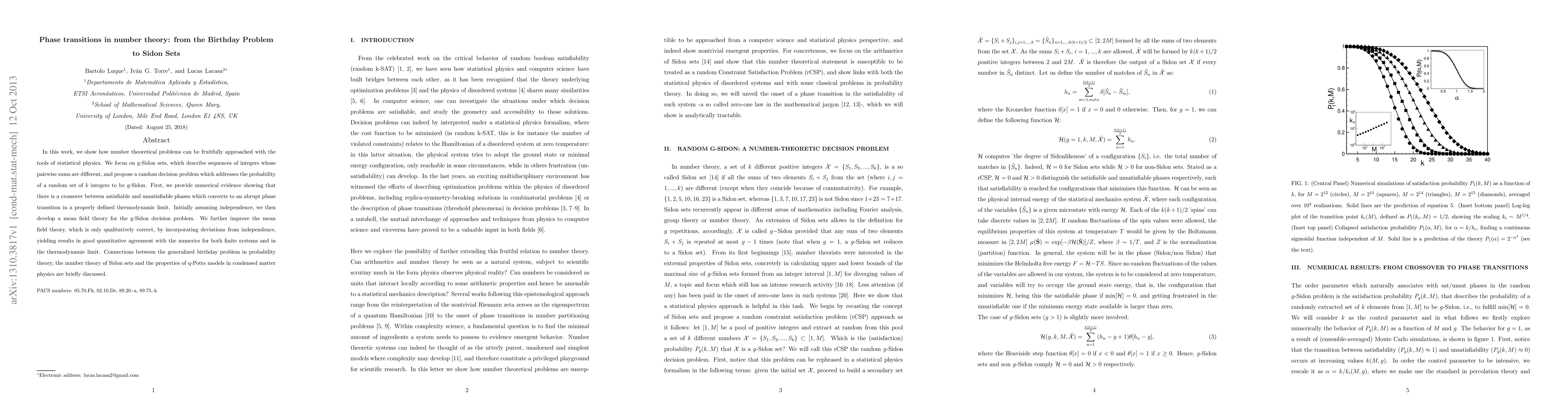 This paper explores number theoretical problems using statistical physics tools, focusing on g-Sidon sets. It demonstrates a phase transition in the probability of random integer sets being g-Sidon, supported by numerical evidence and a refined mean field theory, with connections to the birthday problem and q-Potts models.
