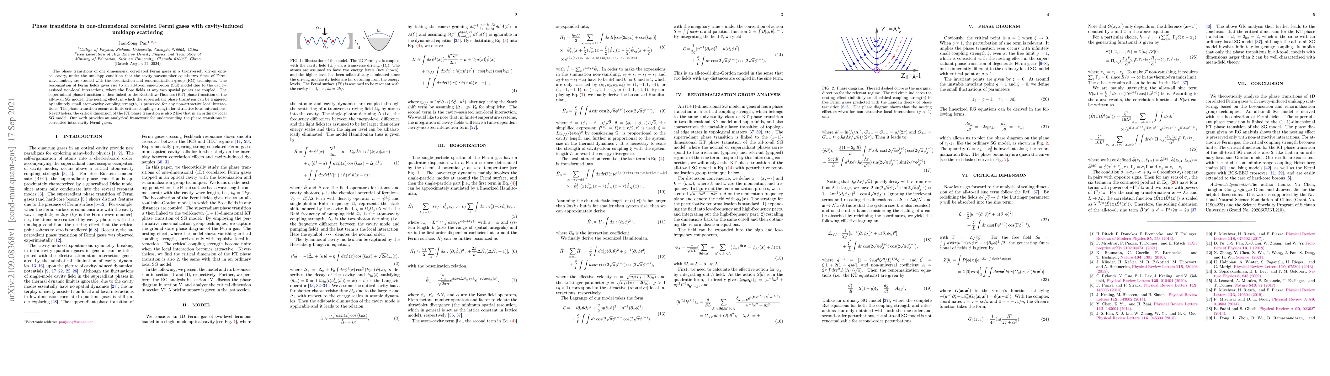 This paper investigates phase transitions in one-dimensional correlated Fermi gases within a cavity, focusing on umklapp scattering conditions. Using bosonization and renormalization group techniques, the study reveals a superradiant phase transition linked to the Kosterlitz-Thouless transition in a sine-Gordon model, highlighting the effects of cavity-induced non-local interactions.