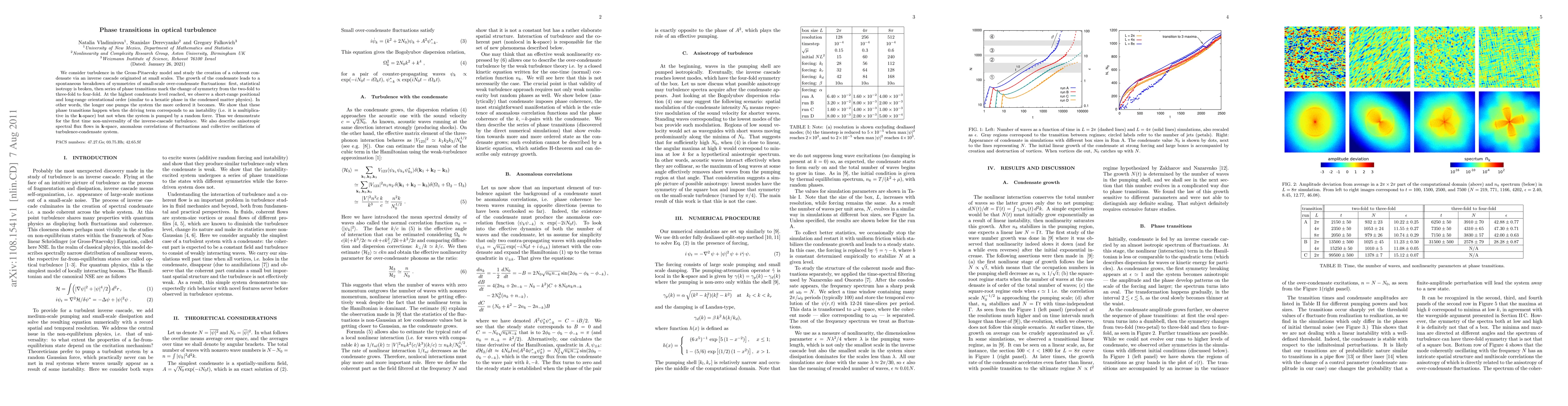 This paper investigates phase transitions in optical turbulence using the Gross-Pitaevsky model, revealing an inverse cascade creating a coherent condensate that leads to symmetry breakdowns and ordered phases. The study finds non-universality in inverse-cascade turbulence and describes anisotropic spectral flows and anomalous correlations.