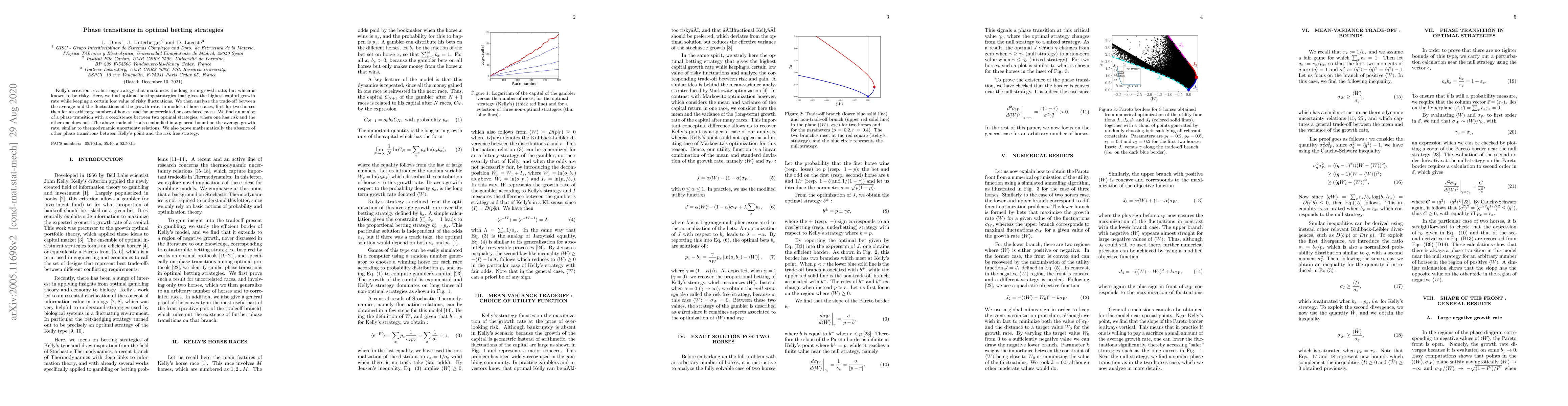 Kelly's criterion is a betting strategy that maximizes the long term growth rate, but which is known to be risky. Here, we find optimal betting strategies that gives the highest capital growth rate while keeping a certain low value of risky fluctuations. We then analyze the trade-off between the average and the fluctuations of the growth rate, in models of horse races, first for two horses then for an arbitrary number of horses, and for uncorrelated or correlated races. We find an analog of a phase transition with a coexistence between two optimal strategies, where one has risk and the other one does not. The above trade-off is also embodied in a general bound on the average growth rate, similar to thermodynamic uncertainty relations. We also prove mathematically the absence of other phase transitions between Kelly's point and the risk free strategy.