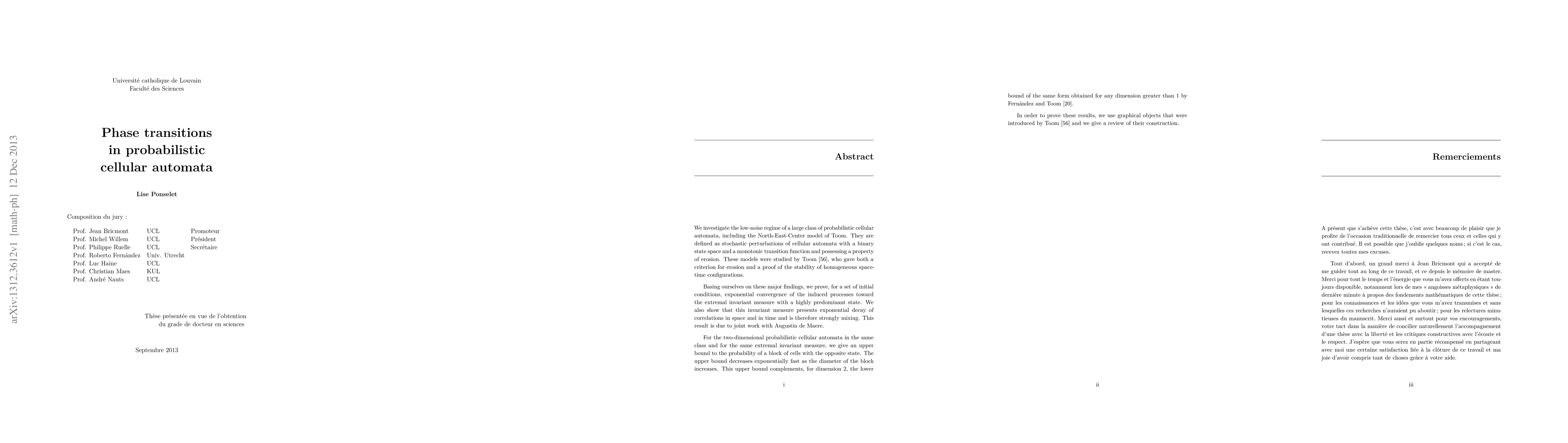The paper presents a detailed analysis of phase transitions in a class of probabilistic cellular automata, providing proofs of exponential convergence and strong mixing properties for extremal invariant measures, along with upper bounds for spatial correlation decay.