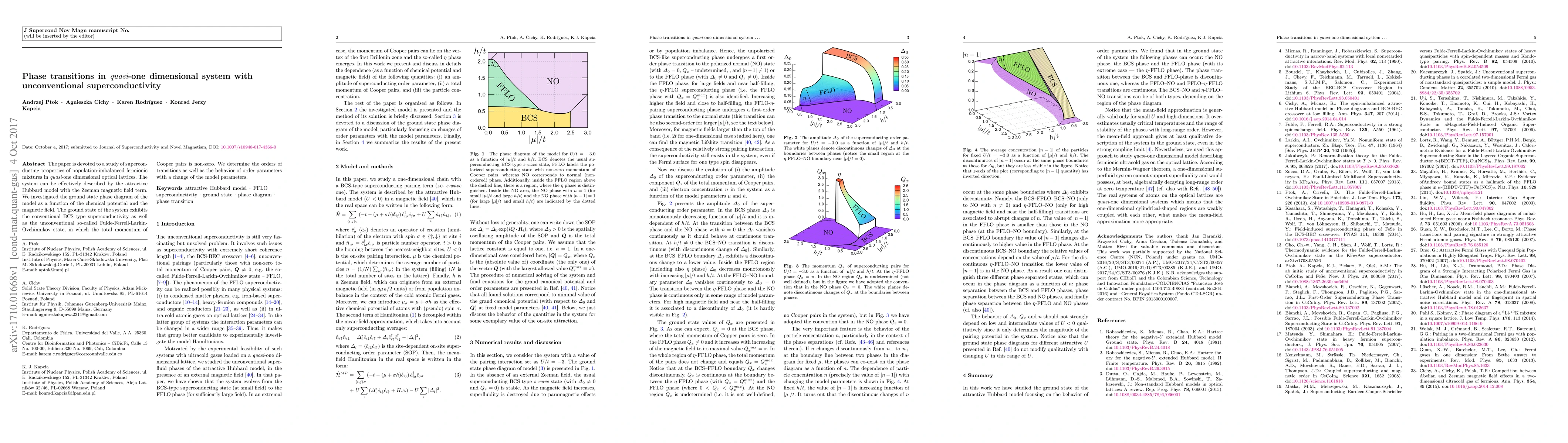 The paper is devoted to a study of superconducting properties of population-imbalanced fermionic mixtures in quasi-one dimensional optical lattices. The system can be effectively described by the attractive Hubbard model with the Zeeman magnetic field term. We investigated the ground state phase diagram of the model as a function of the chemical potential and the magnetic field. The ground state of the system exhibits the conventional BCS-type superconductivity as well as the unconventional so-called Fulde-Ferrell-Larkin-Ovchinnikov state, in which the total momentum of Cooper pairs is non-zero. We determine the orders of transitions as well as the behavior of order parameters with a change of the model parameters.
