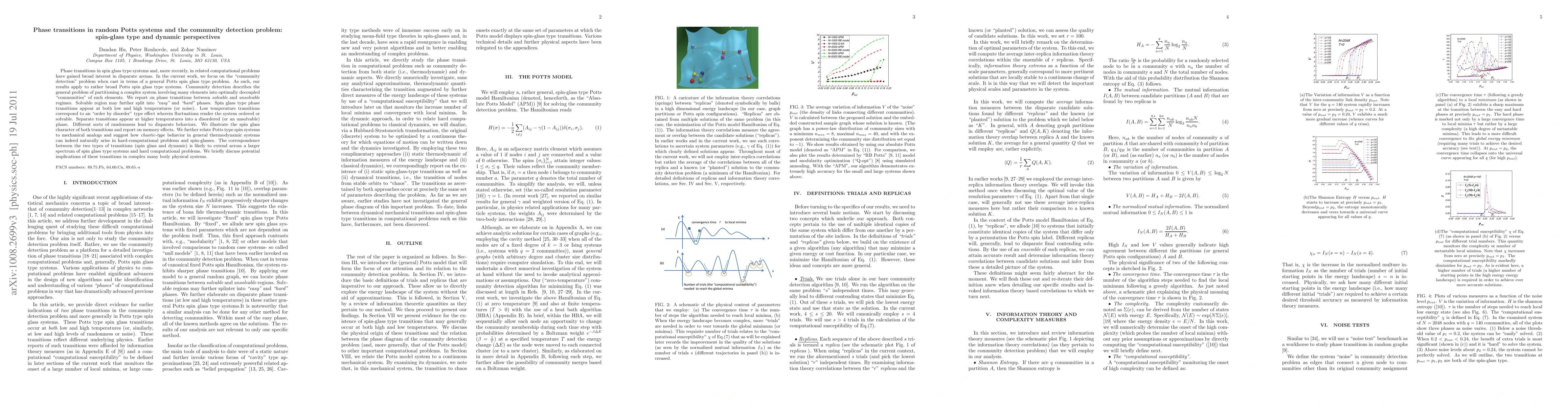 Phase transitions in spin glass type systems and, more recently, in related computational problems have gained broad interest in disparate arenas. In the current work, we focus on the "community detection" problem when cast in terms of a general Potts spin glass type problem. As such, our results apply to rather broad Potts spin glass type systems. Community detection describes the general problem of partitioning a complex system involving many elements into optimally decoupled "communities" of such elements. We report on phase transitions between solvable and unsolvable regimes. Solvable region may further split into "easy" and "hard" phases. Spin glass type phase transitions appear at both low and high temperatures (or noise). Low temperature transitions correspond to an "order by disorder" type effect wherein fluctuations render the system ordered or solvable. Separate transitions appear at higher temperatures into a disordered (or an unsolvable) phase. Different sorts of randomness lead to disparate behaviors. We illustrate the spin glass character of both transitions and report on memory effects. We further relate Potts type spin systems to mechanical analogs and suggest how chaotic-type behavior in general thermodynamic systems can indeed naturally arise in hard-computational problems and spin-glasses. The correspondence between the two types of transitions (spin glass and dynamic) is likely to extend across a larger spectrum of spin glass type systems and hard computational problems. We briefly discuss potential implications of these transitions in complex many body physical systems.