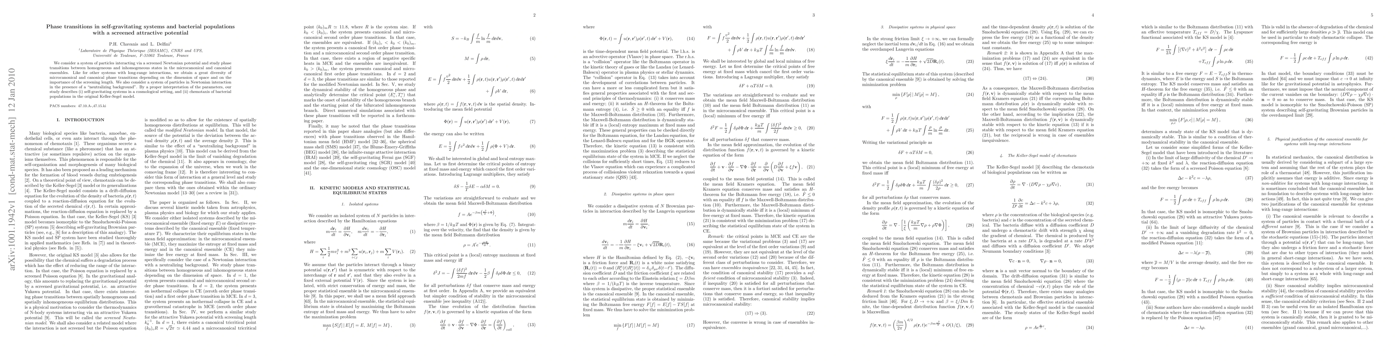 This paper investigates phase transitions in self-gravitating systems and bacterial populations interacting via a screened attractive potential, revealing diverse microcanonical and canonical phase transitions influenced by spatial dimension and screening length. The study also interprets the results to describe cosmological self-gravitating systems and chemotaxis in bacterial populations.