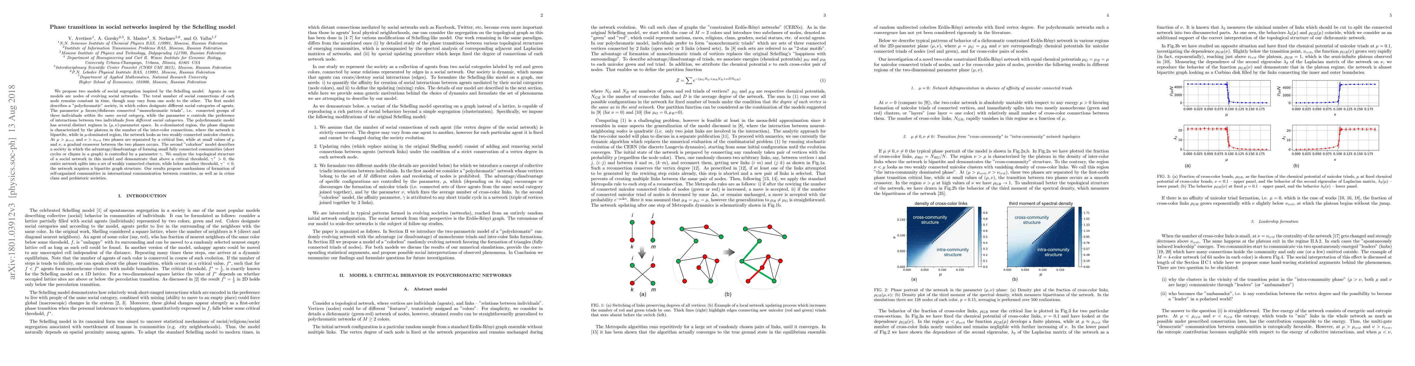 We propose two models of social segregation inspired by the Schelling model. Agents in our models are nodes of evolving social networks. The total number of social connections of each node remains constant in time, though may vary from one node to the other. The first model describes a "polychromatic" society, in which colors designate different social categories of agents. The parameter $\mu$ favors/disfavors connected "monochromatic triads", i.e. connected groups of three individuals \emph{within the same social category}, while the parameter $\nu$ controls the preference of interactions between two individuals \emph{from different social categories}. The polychromatic model has several distinct regimes in $(\mu,\nu)$-parameter space. In $\nu$-dominated region, the phase diagram is characterized by the plateau in the number of the inter-color connections, where the network is bipartite, while in $\mu$-dominated region, the network looks as two weakly connected unicolor clusters. At $\mu>\mu_{crit}$ and $\nu >\nu_{crit}$ two phases are separated by a critical line, while at small values of $\mu$ and $\nu$, a gradual crossover between the two phases occurs. The second "colorless" model describes a society in which the advantage/disadvantage of forming small fully connected communities (short cycles or cliques in a graph) is controlled by a parameter $\gamma$. We analyze the topological structure of a social network in this model and demonstrate that above a critical threshold, $\gamma^+>0$, the entire network splits into a set of weakly connected clusters, while below another threshold, $\gamma^-<0$, the network acquires a bipartite graph structure. Our results propose mechanisms of formation of self-organized communities in international communication between countries, as well as in crime clans and prehistoric societies.