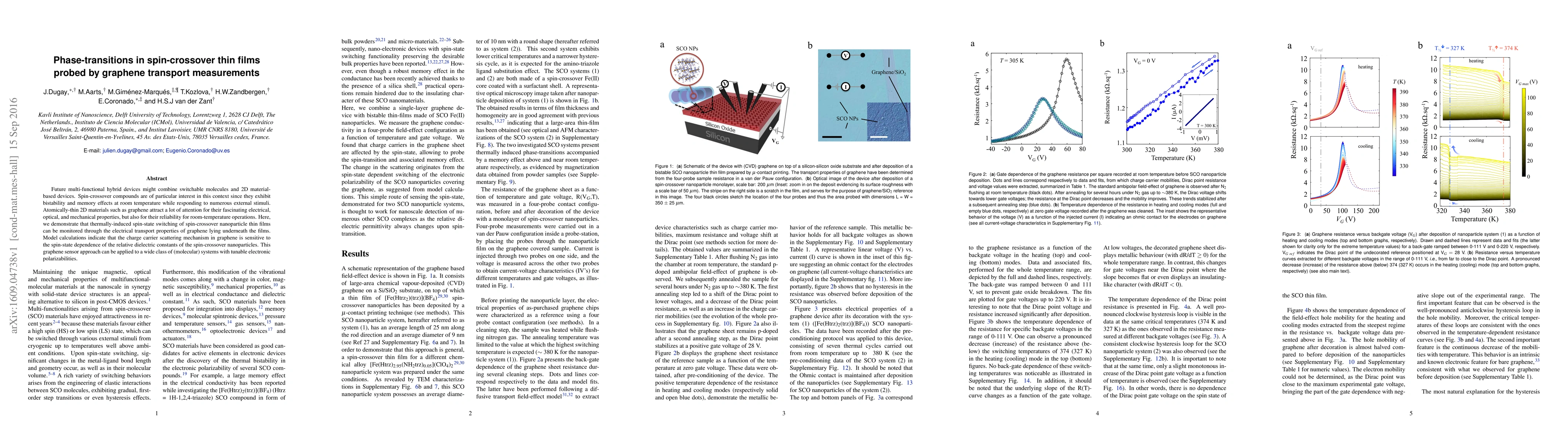 This paper investigates the use of graphene transport measurements to monitor phase transitions in spin-crossover thin films, revealing that the electrical properties of graphene are sensitive to the spin-state changes in the films. This method provides a reliable way to detect spin-state switching in various molecular systems.